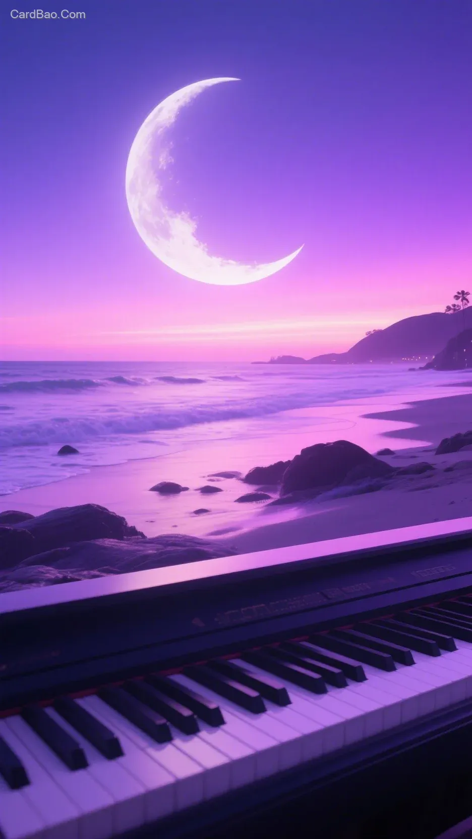 - Silhouette of a distant coastline or piano under moonlight.