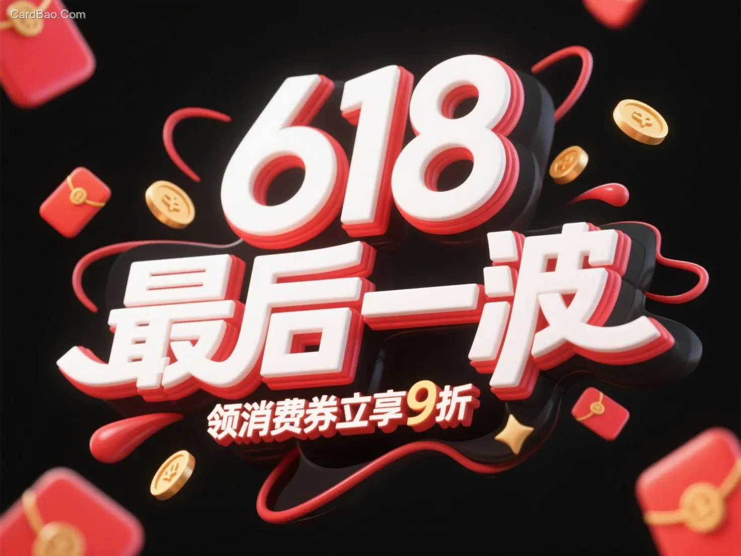 黑色背景,3D白色立体艺术字,边缘有3D红色渐变描边,创意字体设计,流畅且富有艺术感,中文"618最后一波",设计灵感:将字体进行抽象变形,给人以强烈的视觉冲击。高级感,扁平化,大师作品,小字"领消费券立享9折",整体氛围热闹生动,周围有飘动的红包和金币等作为装饰,OC渲染,3D,大师级,8K