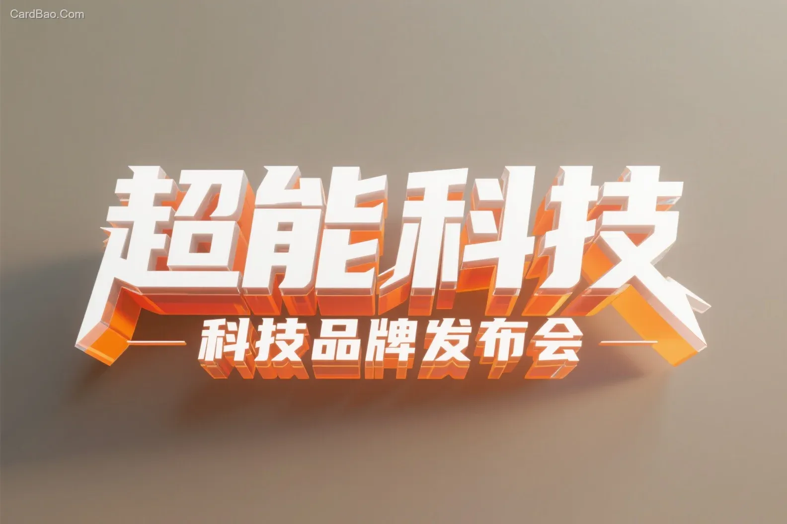 Subtitle "Tech Brand Launch Event", with a strong sense of three-dimensionality, multi-layered glass thickness, and orange-red gradient highlights on the edges of the text to simulate the texture of light reflection. The strokes are bold and robust, set against a solid-color background.