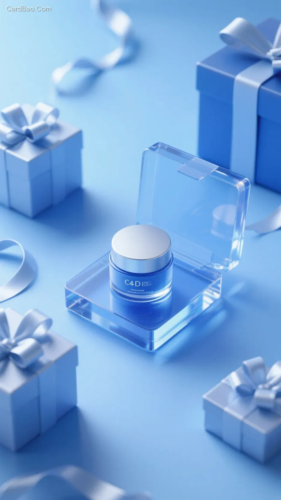 Skincare product scene, main color tone blue, product as the visual center, low-angle perspective, surrounded by gift boxes and ribbon decorations, decorations in 3D glass material, C4D modeling, Octane rendering texture, soft blue ambient light creating a clean and safe feeling, overall presenting a premium look, minimalist composition, medium depth of field, ultra-close-up shooting perspective, ultra-HD 8K.