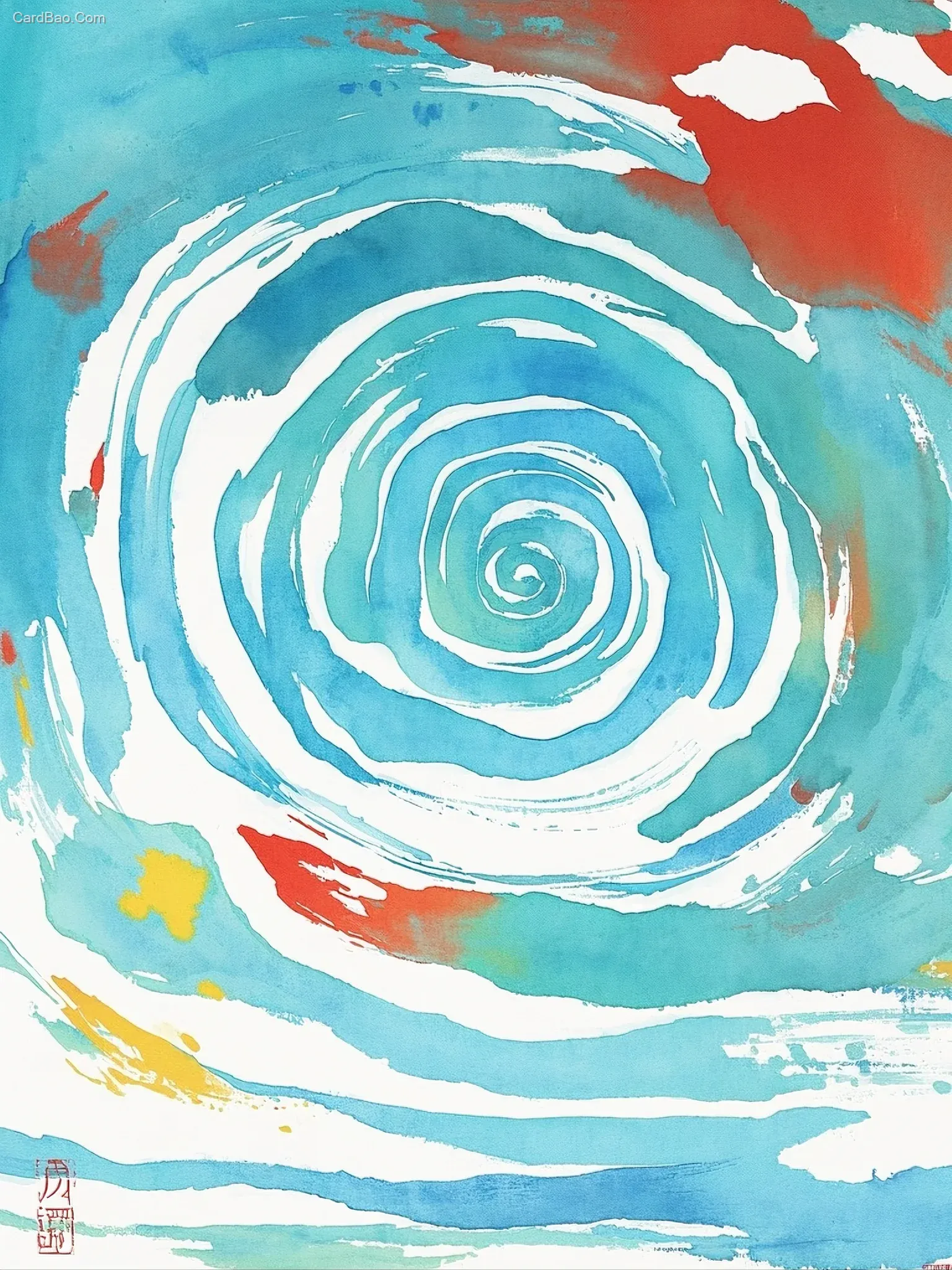 水墨水彩画,水波流动,涟漪晕染,蓝色为主,晕染红色黄色,细节处透露出一些暖色,敦煌的色彩,拓印插画,水墨晕染,大写意,大留白,极简