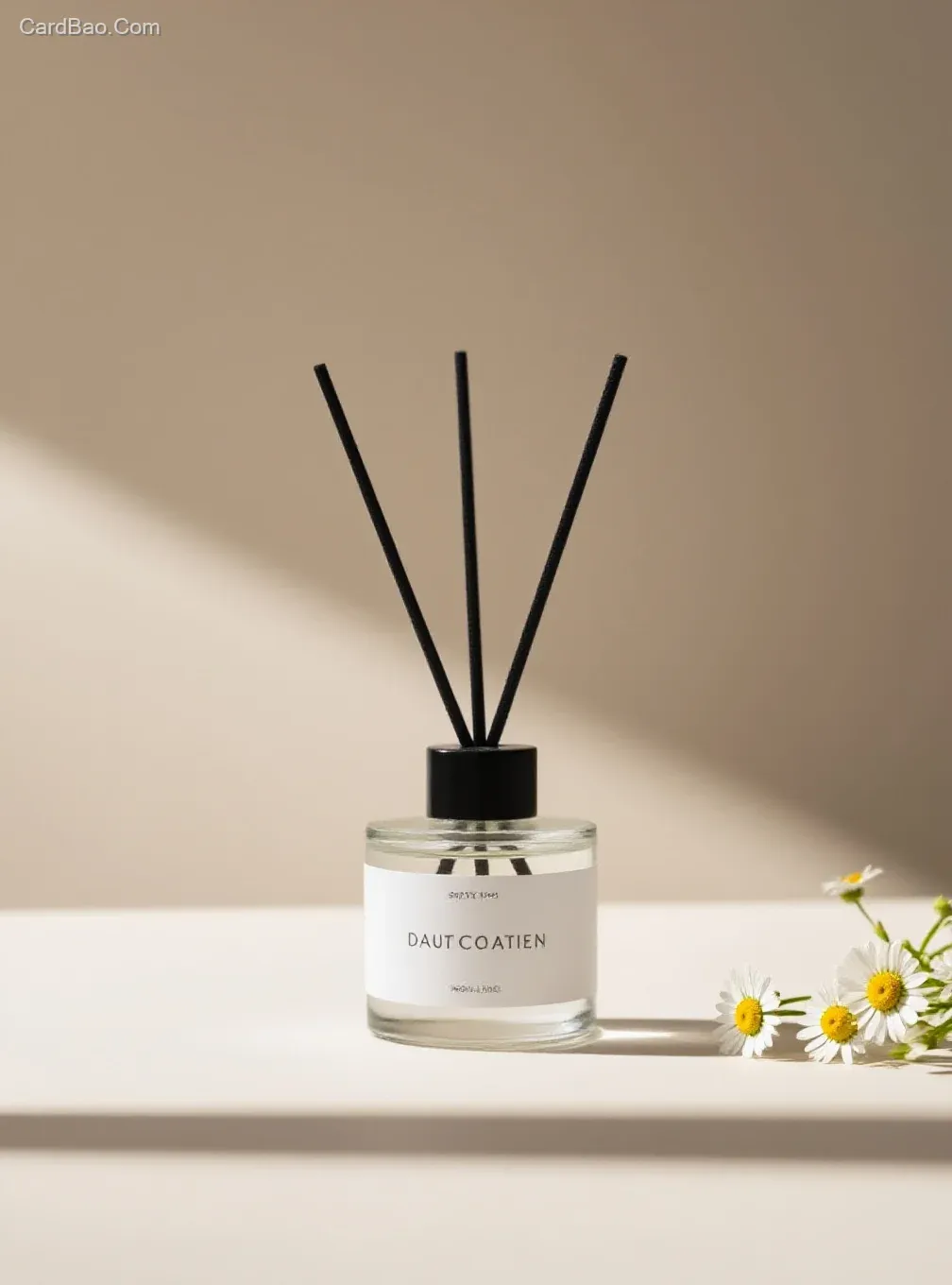 ##静物摄影,香薰摄影,小雏菊,极致的柔光 + 侧逆光布光。光线从瓶身侧后方打来,柔和地勾勒出瓶身的精致轮廓(尤其是瓶口、棱角)和内部液体的通透感,瓶身正面大部分区域自然过渡到柔和的阴影中,在米灰色背景上,投射下非常非常淡、边缘模糊、像水波晕染开一样的光影形态
