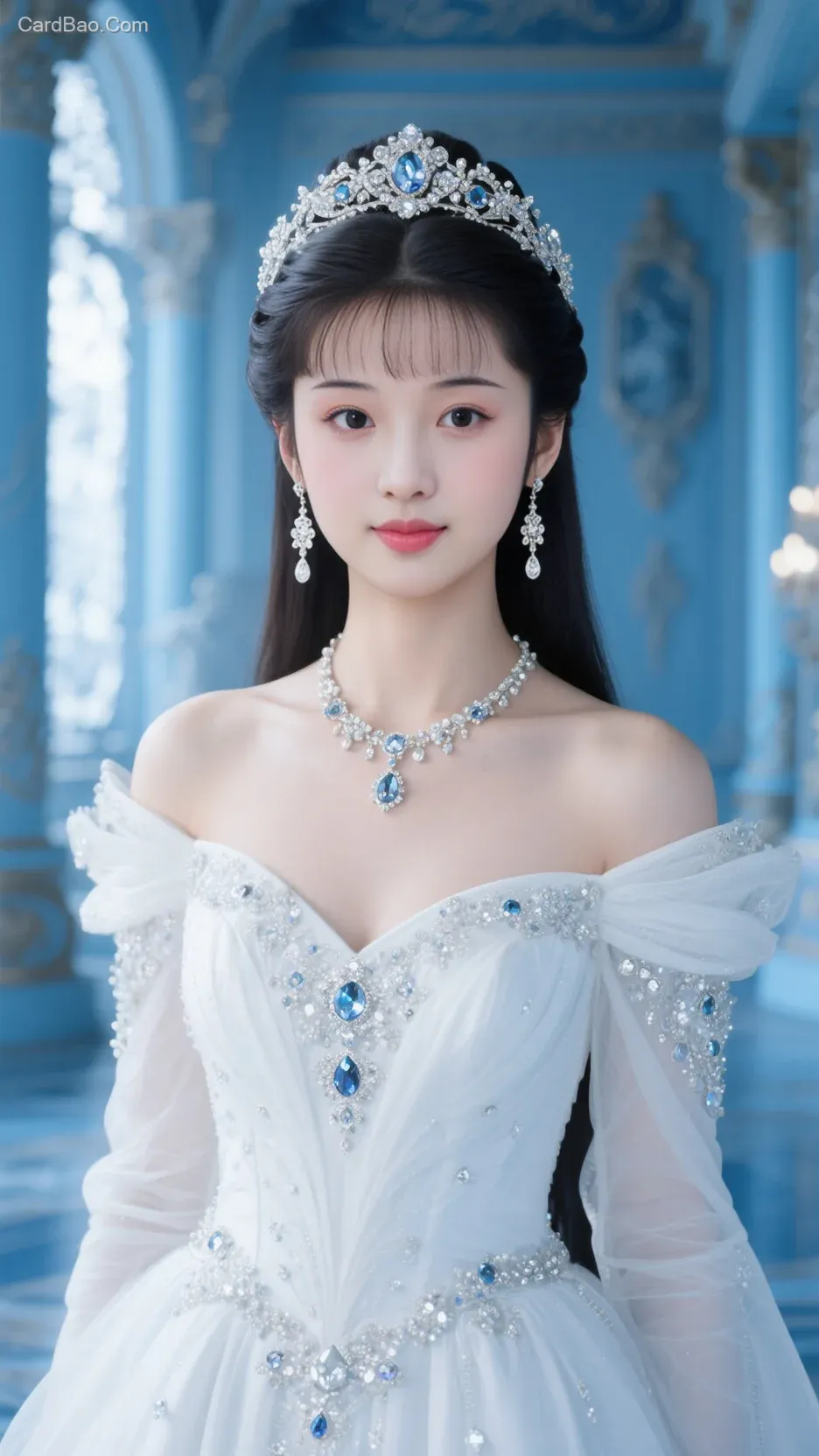 Portrait photography, digital art style, stunningly beautiful woman, breathtaking elegance, wearing a high-end white diamond-encrusted gown, luxurious accessories, flawless fair skin, exquisite ornate headpiece, 18 years old, oval face, delicate facial features, peerless beauty, refined natural makeup, intricate earrings and necklace, captivating large eyes, cherry-like lips, luxurious palace background, blue-toned lighting, full-body outfit display. Cinematic lighting effects, film grain texture. 32K ultra-high definition, extreme detail precision.