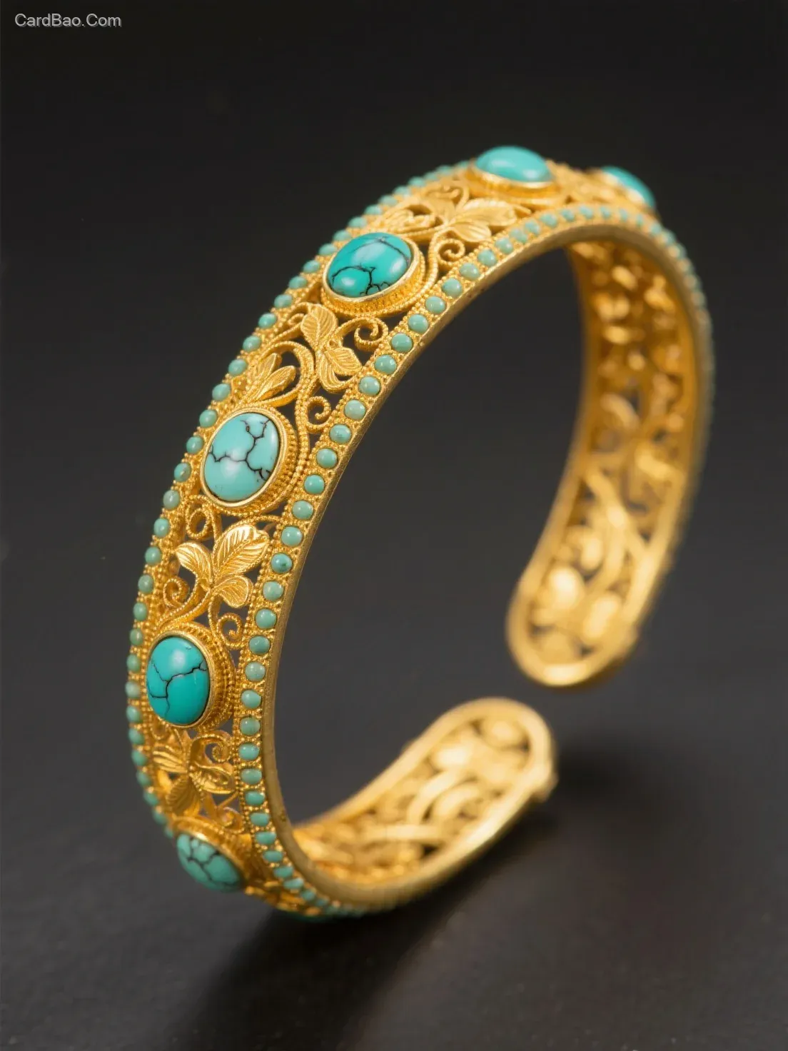 Golden bracelet, ancient method gold, filigree craftsmanship, intricate design, the surface of the bracelet is inlaid with small pieces of turquoise, a total of 6 turquoise stones embedded in the entire bracelet, complete circle opening.