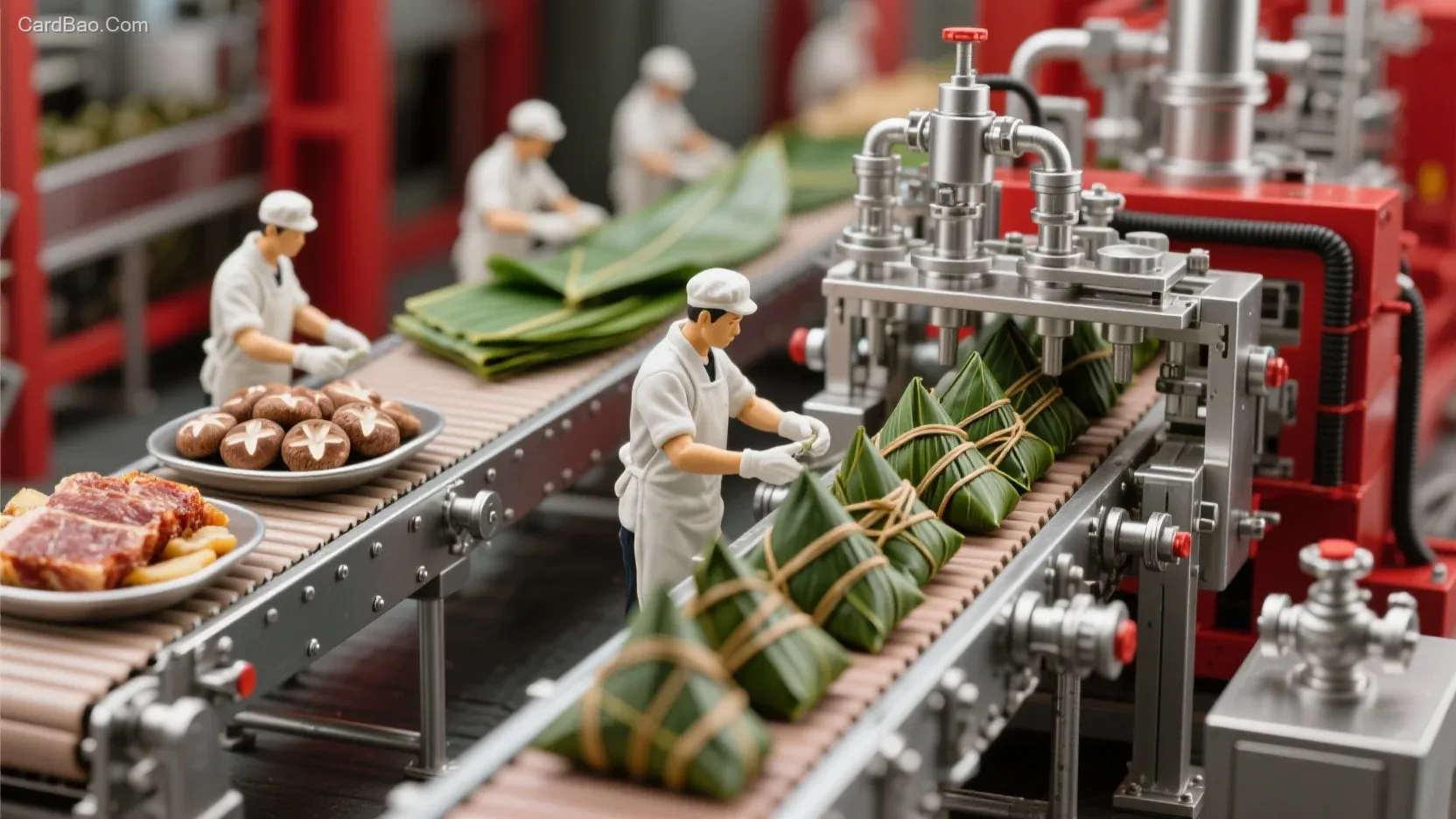 [Industrial Style] A 15cm-tall worker operates a 5-meter-long production line, | featuring two conveyor belts—the left one carrying roasted pork and shiitake mushrooms, the right one carrying bamboo leaves—which merge into a single assembly line. A fully automated assembly machine completes the final step, with large zongzi neatly moving along the conveyor. | A miniature quality inspector checks the products, | detailed steam valves are visible, | industrial-grade stainless steel equipment is used, | a contrast ratio of 1:150 is maintained, | Chinese red color scheme is applied, | metal material rendering is emphasized, | and the scene depicts dynamic work operations.