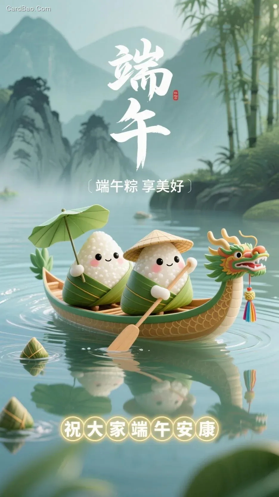 - Dynamic poses: Left zongzi holding a lotus leaf umbrella, right zongzi gripping an oar in rowing motion