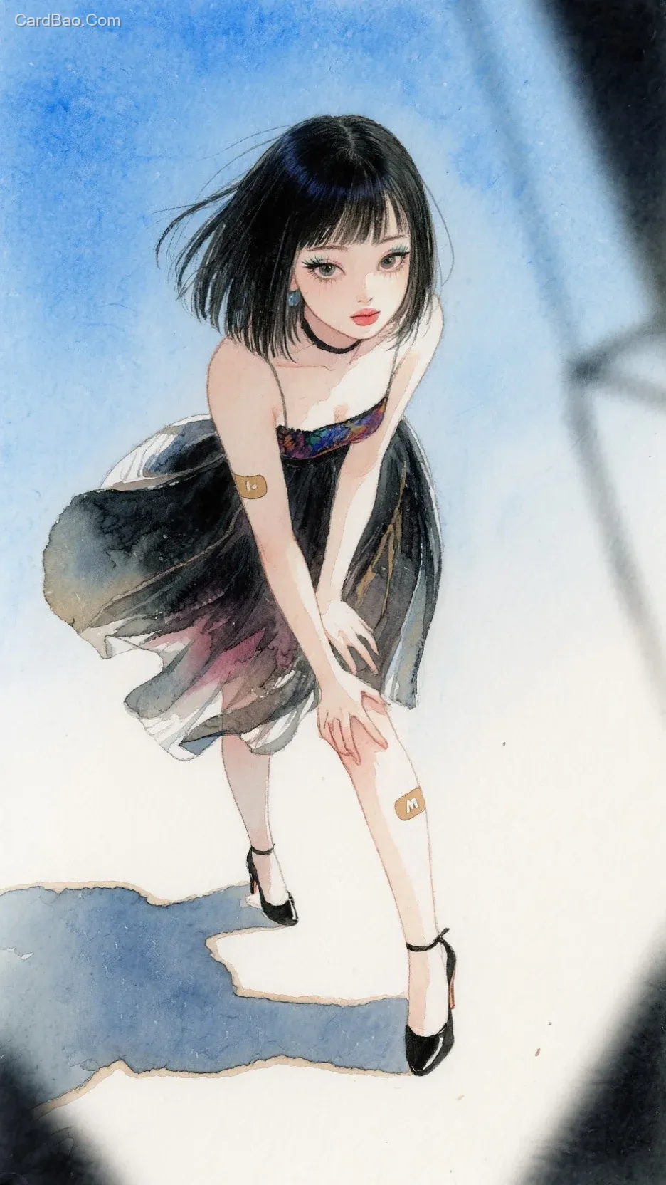 融合Becca Doodlefly、Sandara Tang的细腻渐变和天野喜孝的飘逸装饰,使用水彩厚涂技法搭配哑光质感,强调人物轮廓,整体呈现胶片颗粒感与电影风碰撞的美感。俯视镜头,都市感,高斯模糊,晕染,阴影细节丰富,透视感强烈,波普艺术融合野兽派风格。Lnplick风格时尚韩系美少女,创可贴,全身,高跟鞋,俯视角,风吹起裙摆,用手按住动作,羞涩表情,蓝天背景,眼线,眼影,长直发,波波头,发尾翘起,动人,动感,飘逸头发,发丝划过脸颊,突显发丝凌乱美,氛围感,眼部特写,m形唇,杏眼,阴影,暗调前景。