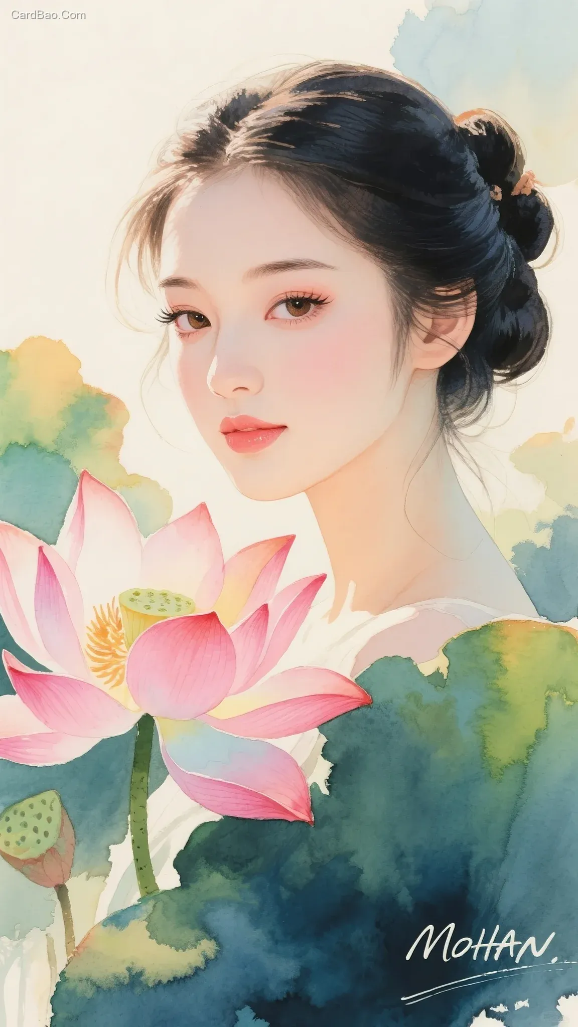 Gouache and watercolor, rich and vibrant colors, combining a radiant lotus in sunlight with a stunning beauty featuring an updo, large expressive eyes, and long lashes. The composition exudes understated luxury, with delicate color washes, refined brushstrokes, and ink-like blending effects. Signed in the lower right corner: MOHAN.