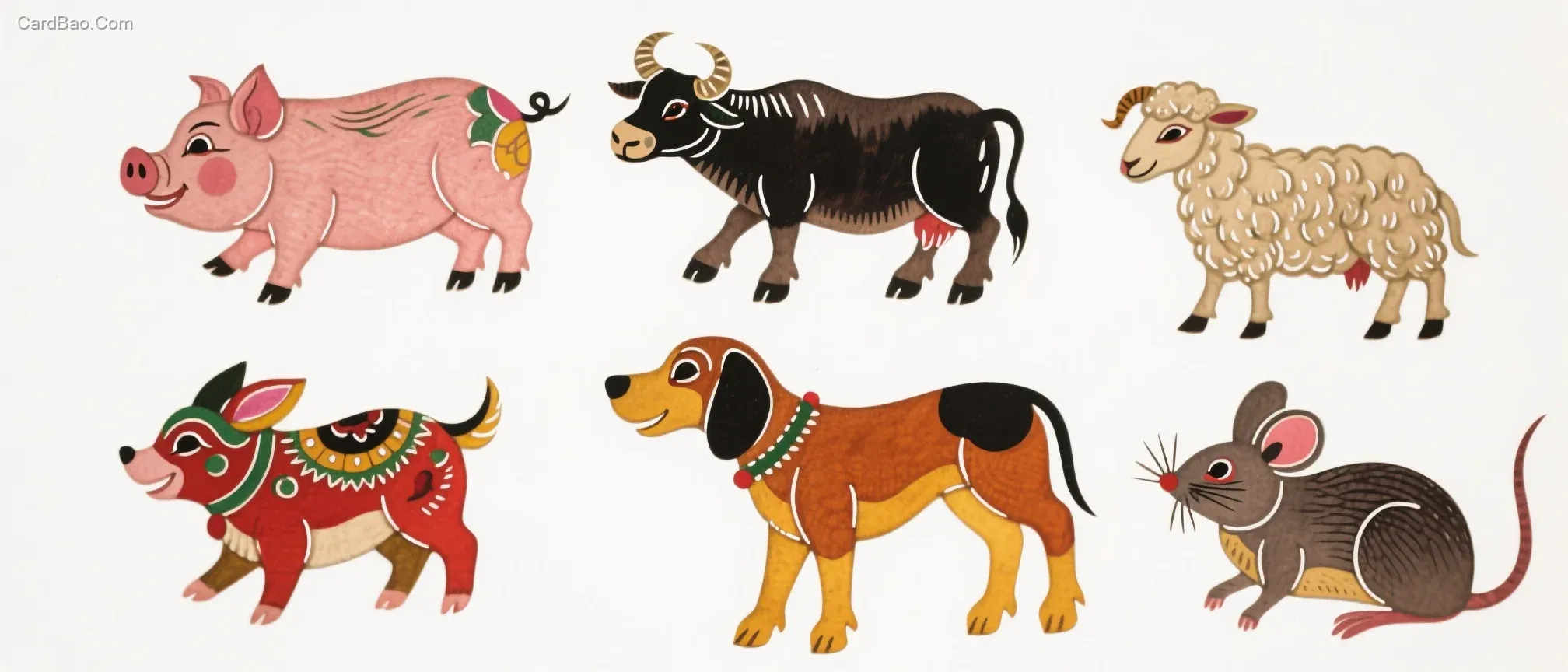 皮影戏风格, 猪羊牛狗兔鼠, 色彩, 白底, 最高质量, 完整呈现,