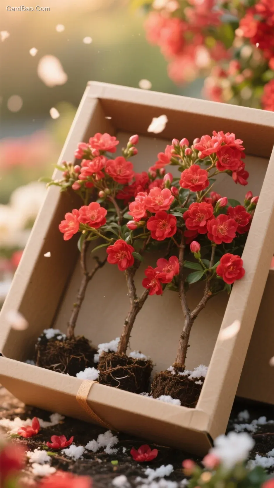In this small floral haven, an exquisite gift box holds five fragrant redwood saplings, their branches adorned with blossoms like fiery dreams. A gentle breeze stirs, sending petals cascading like snowflakes, whispering romantic secrets. Amidst the clamor of the world, discovering this touch of natural poetry allows the soul to return home, quietly savoring time's tender embrace.
