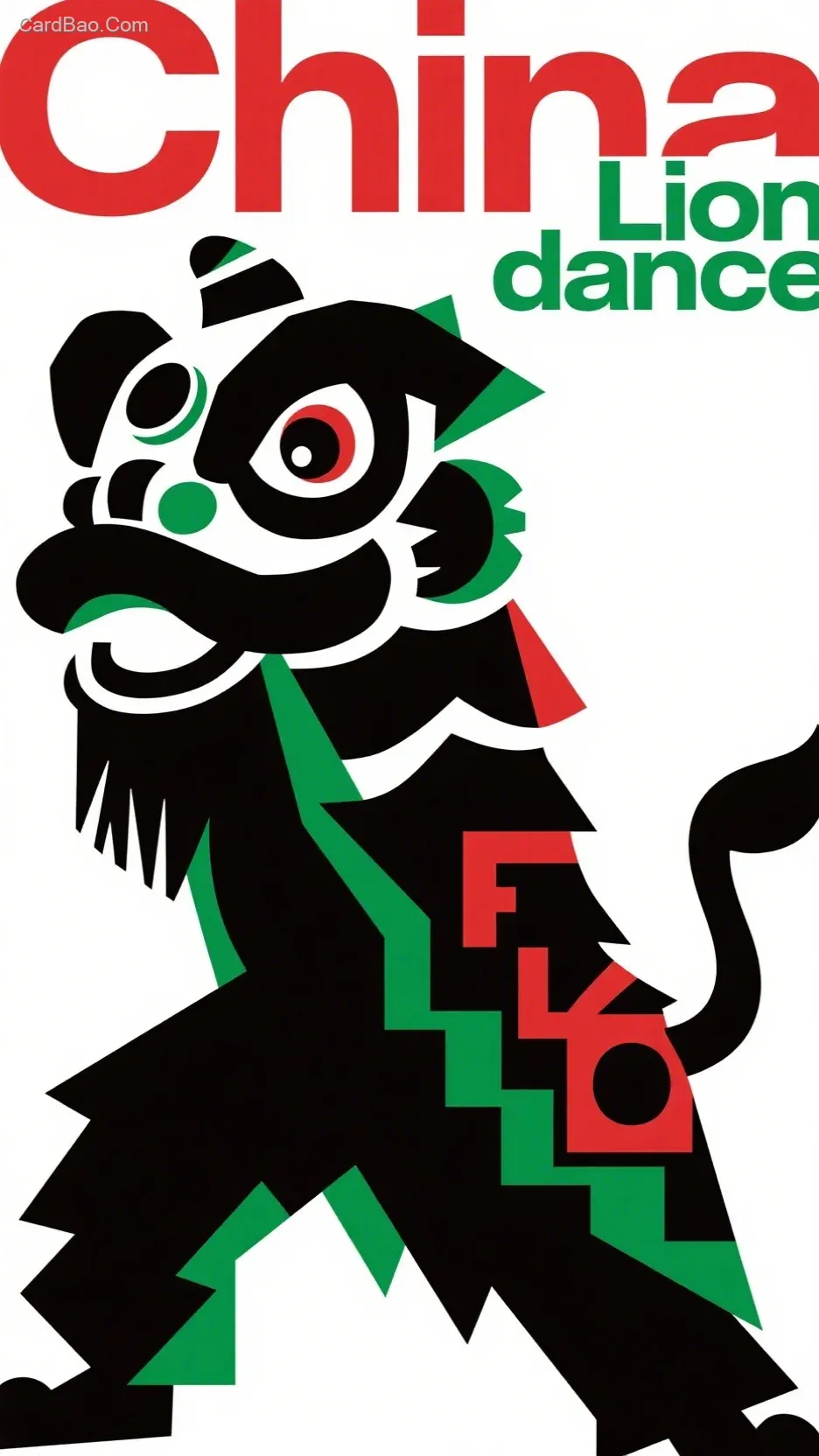 现代电影海报,文字云构成的舞狮图,白色背景干净整洁,文字有机地创造出舞狮的外形和特征包括:大眼睛、China、Lion dance,无缝集成的块状排版、大胆的角度、实验性的框架、极简主义构图 配色方案:红色、绿色、黑色、白色,利用负空间来增强剪影效果