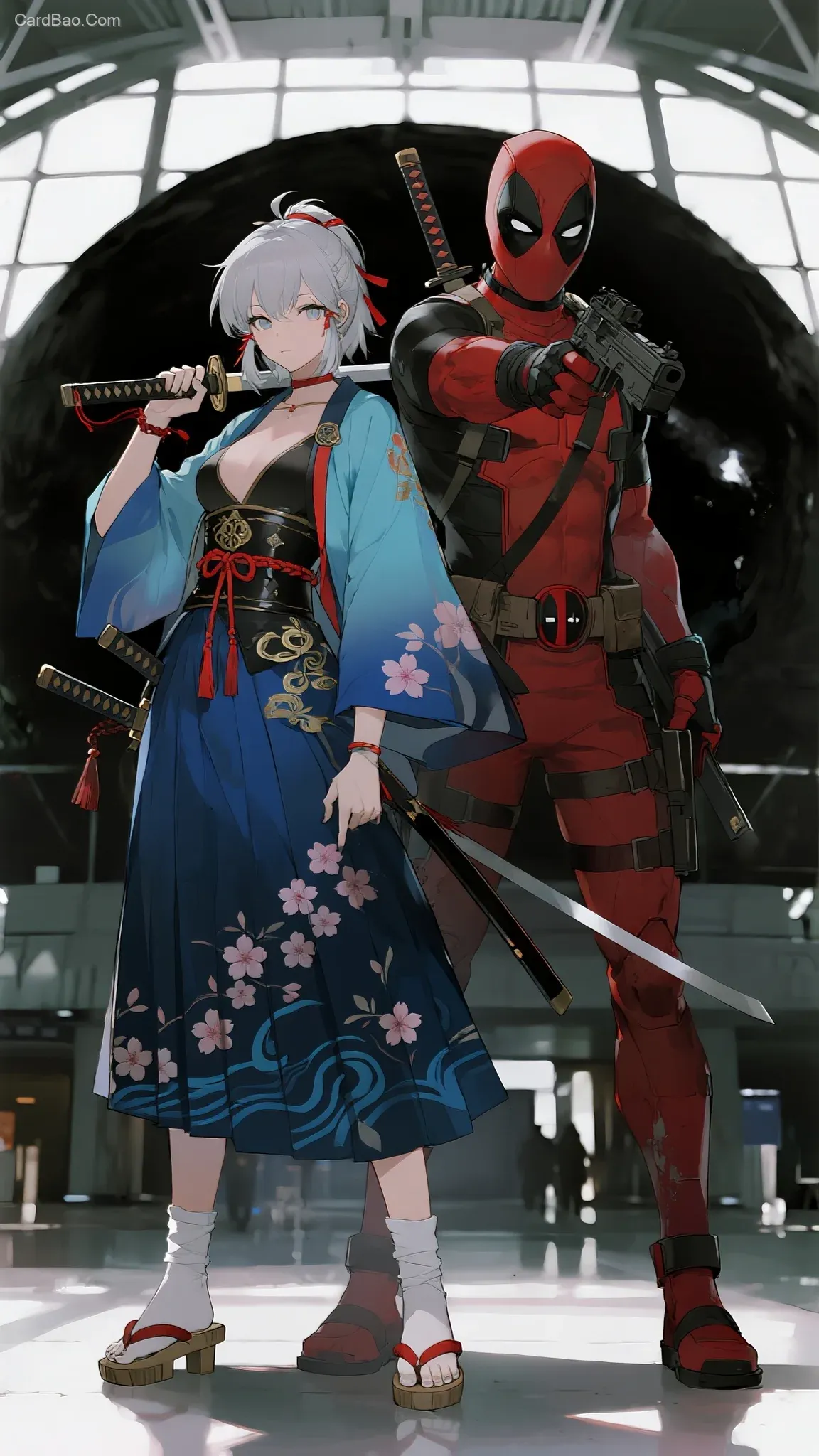 角色2:漫威死侍 死侍一边手拿枪支 一边手持武士刀 全身肌肉紧绷呈攻击姿态,眼神直视镜头,高清面部特写配合超现实主义风格,32k分辨率电影级构图高对比度光影突显人物质感与面部细节