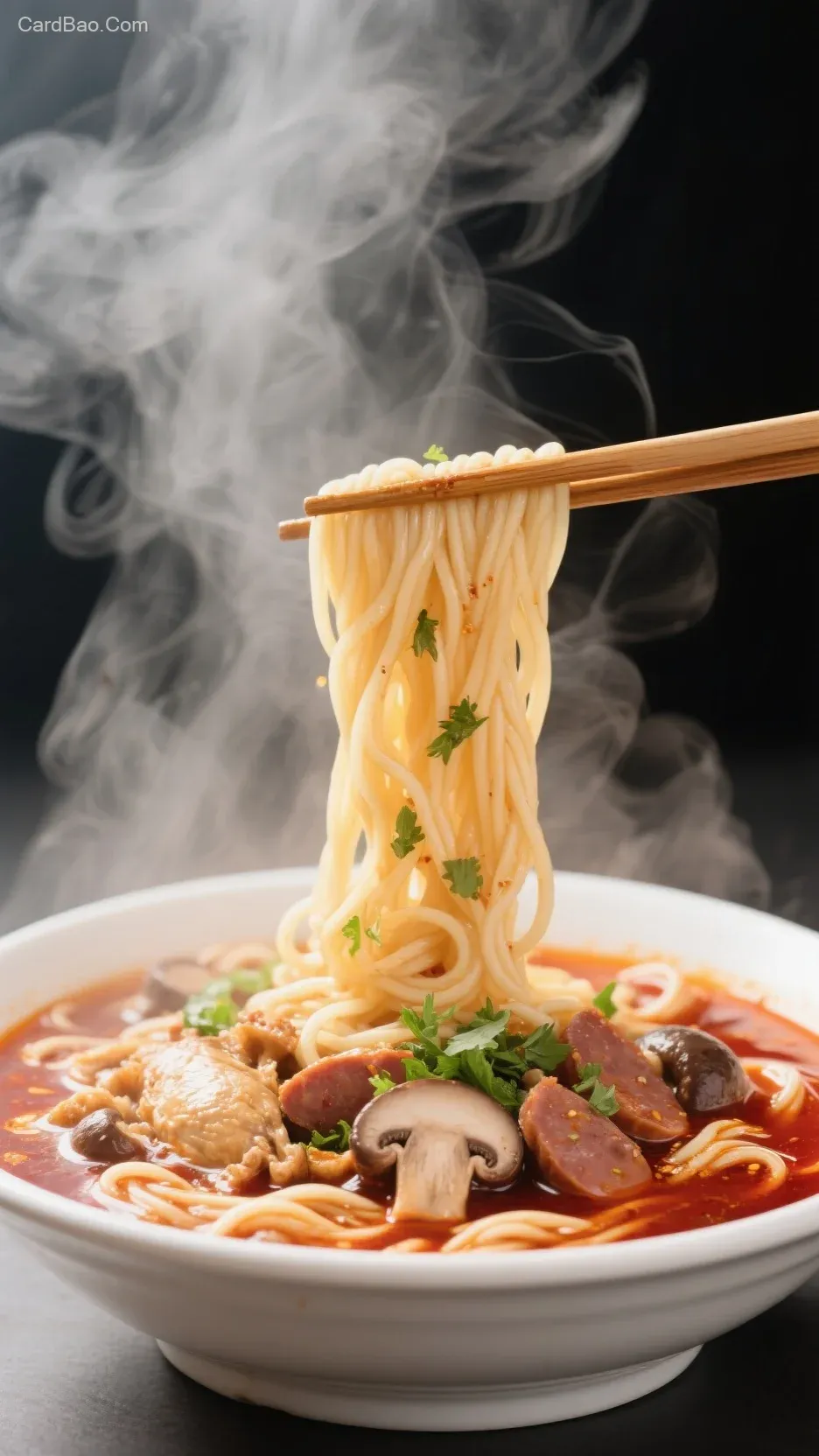 白色的热蒸汽,雾气飘荡在空气中可见,特写镜头,贵阳特色美食肠旺面,鸡肉汤,细腻的红油与新鲜蘑菇搭配,汤体浓郁香滑,撒上碎香草点缀,呈现出中国南方美食风味。一双筷子挑起许多根面条。
