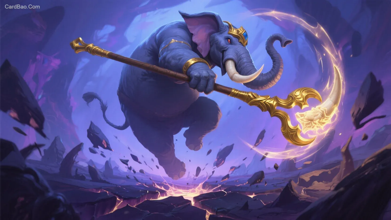 一个人形大象的游戏角色 英雄联盟英雄设计 身体腾空用象鼻抽打地面,产生一到裂隙,从地底冒出许多 手里拿着金色金光闪闪的法杖,法杖的头部是象牙雕的象头灵魂