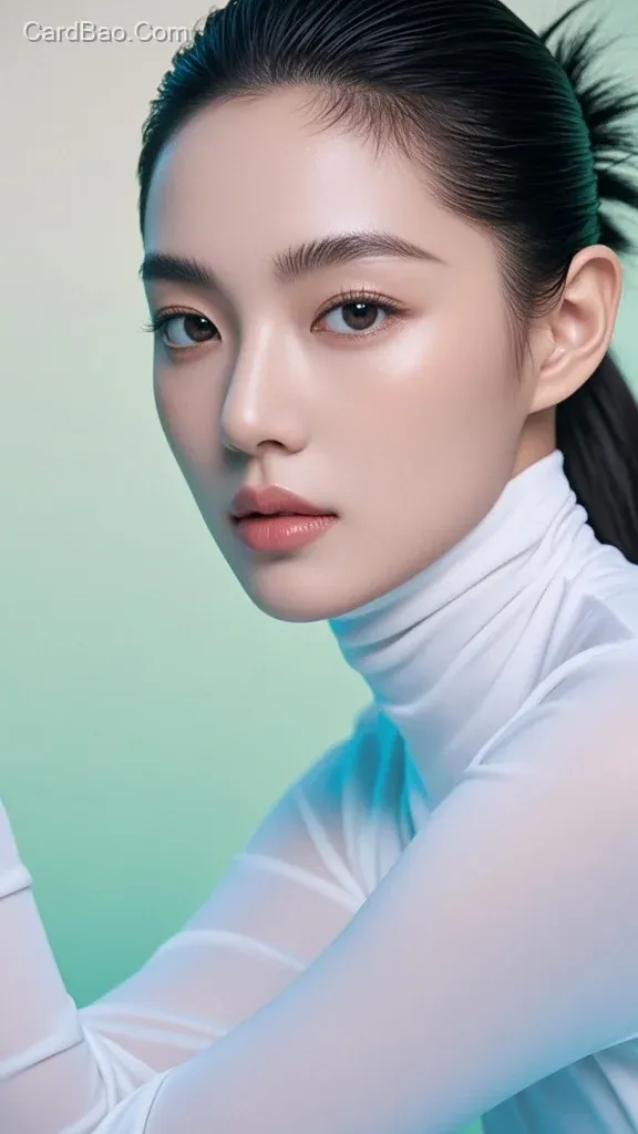 超高清,超细腻,超写实,美丽女模特,五官精致,眼部精致,眼睛坚定有神,头部肩膀胳膊展示完整,微雕皮肤细腻光泽纹理可见,背景浅绿色浅蓝色白色高级感配色,大师摄影,大片,超高清