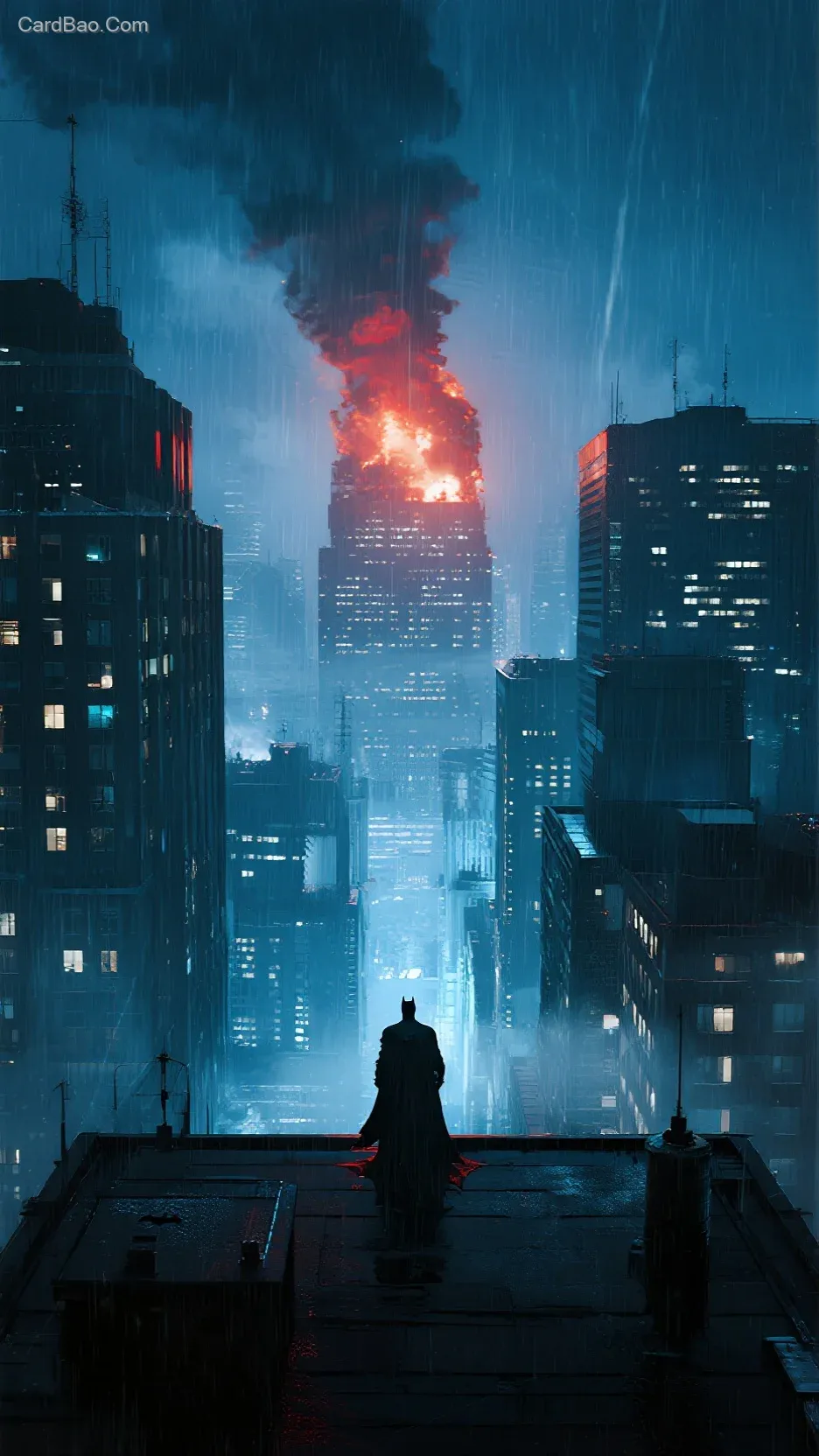 3D风格,CG,极繁,细致,现代,蝙蝠侠,哈气,故事感,氛围感,主角站在房顶,从上往下看,远方是都市大厦,大厦上方起火了,蝙蝠侠注视大厦,暴雨天,黑夜,微光,史诗感。