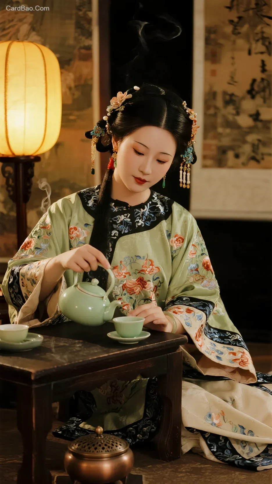 顶级古典大气美女贵妇定制刺绣旗袍坐在顶级豪华和室茶席前,优美的手持高端青瓷茶壶正在点茶。背景呈现高端茶楼 茶席上摆放着顶级天目茶碗与高端铜制香炉,暖黄色灯光从纸灯笼中透出,茶汤氤氲的热气与女子发髻垂落的发丝形成动态美感,墙上悬挂的狂草书法卷轴与旗袍刺绣形成纹样呼应。 姿势多变 发型多种 服装多种 茶具多种 特写镜头 60K 大师制作