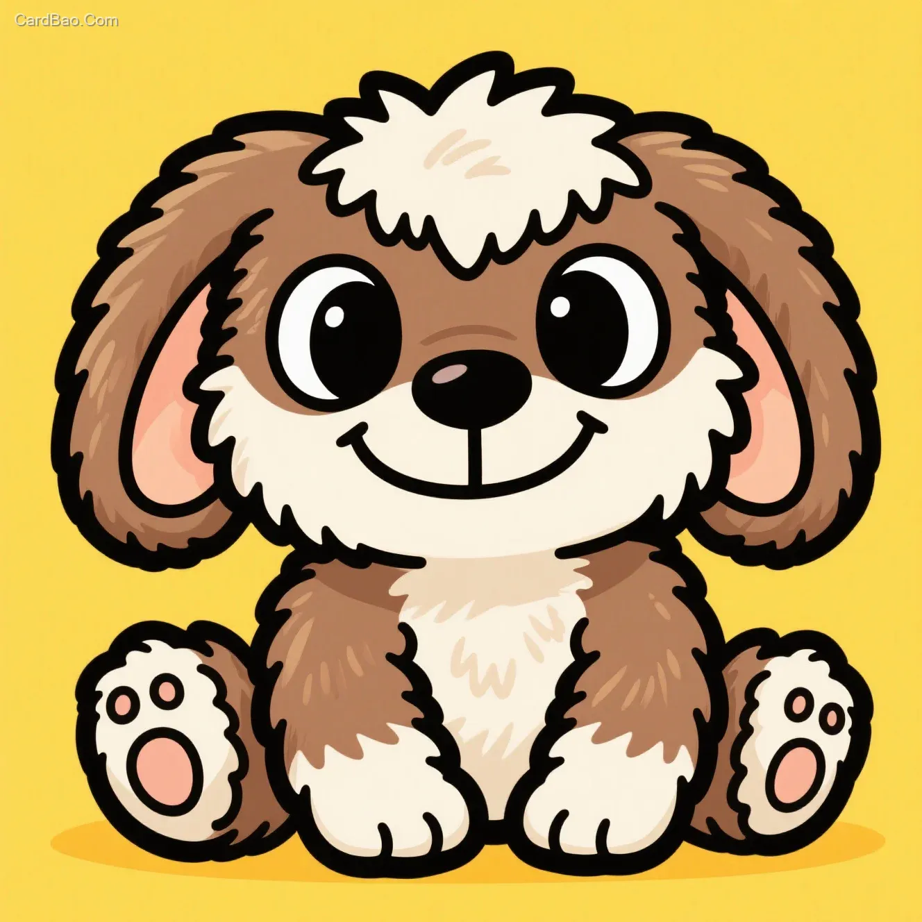 可爱卡通奇幻生物,大垂耳,棕白毛绒皮毛,微笑表情配大眼睛,坐姿,粗黑轮廓线,复古毛绒玩具风格,亮黄色背景