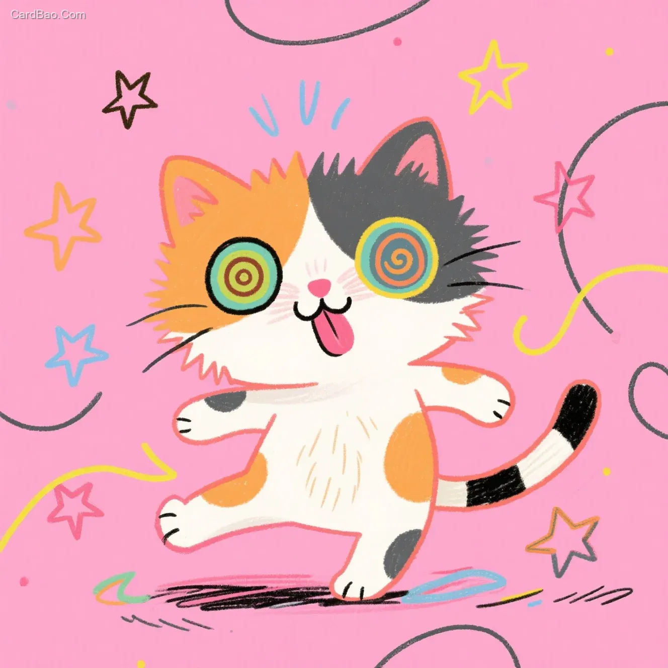 Colorful simple line drawing, illustration, lively and playful with a hand-drawn touch, anthropomorphic calico cat (large head, small body) spinning, eyes turned into spirals, tongue sticking out, all fur standing on end, surrounded by stars and chaotic lines, pink background.