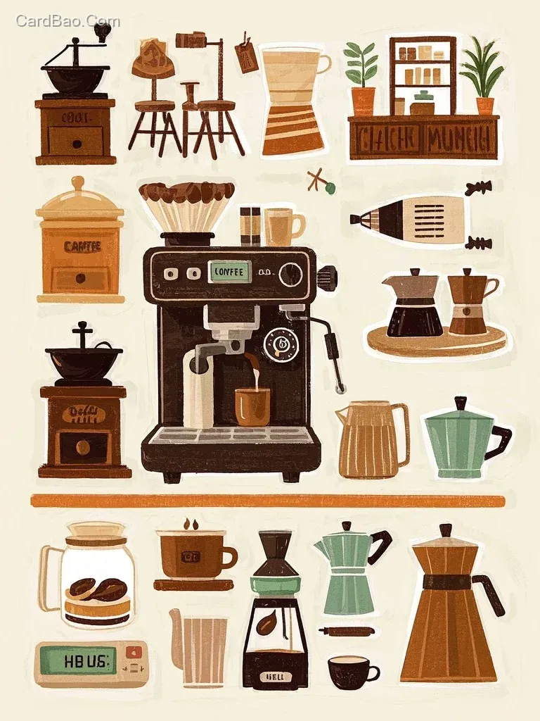 手账贴纸,卡通,咖啡包,咖啡机,磨豆机,咖啡壶,咖啡色,摩卡壶,电子秤,拉花缸,手冲壶,咖啡杯,卡通手绘,有简单的表情,高清图