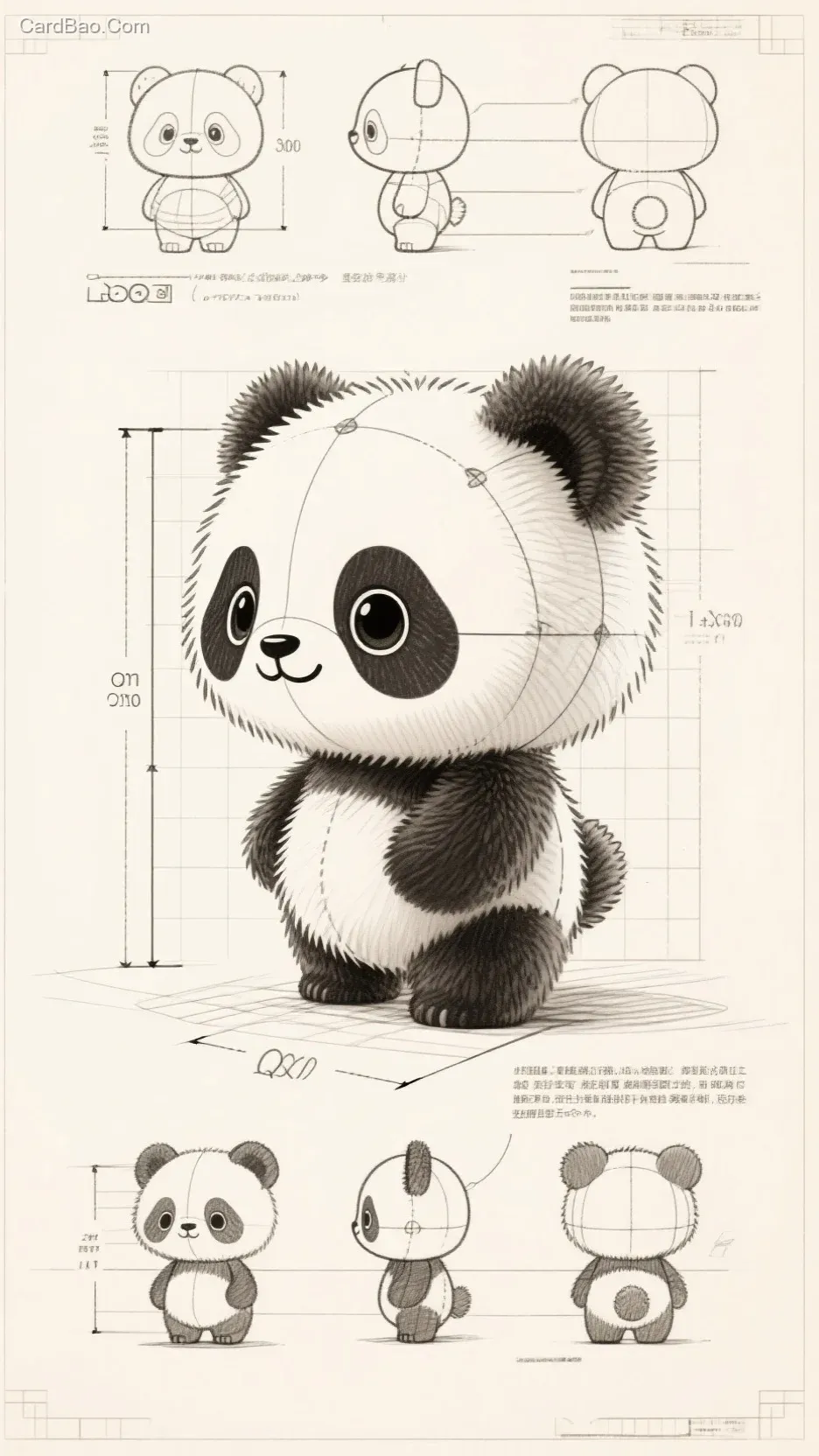 以蓝图的风格制作Q版的毛茸茸的小熊猫,设计草图。并包括尺寸和解释性文本注释。应使用线条和测量值来指示各个部位的尺寸,给草图以技术和详细的感觉。除了主要设计外,还包括显示不同角度的零散缩略图,立体景深