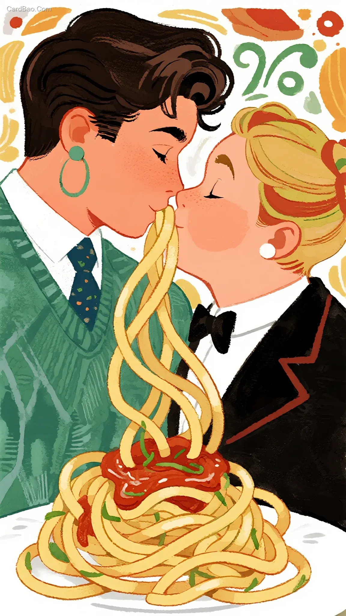 布里格斯与阿道夫松,钢笔水彩插画,缠绕变形的意大利空心面条组成一对恋人拥吻的情景。装饰性线描+高对比色块。