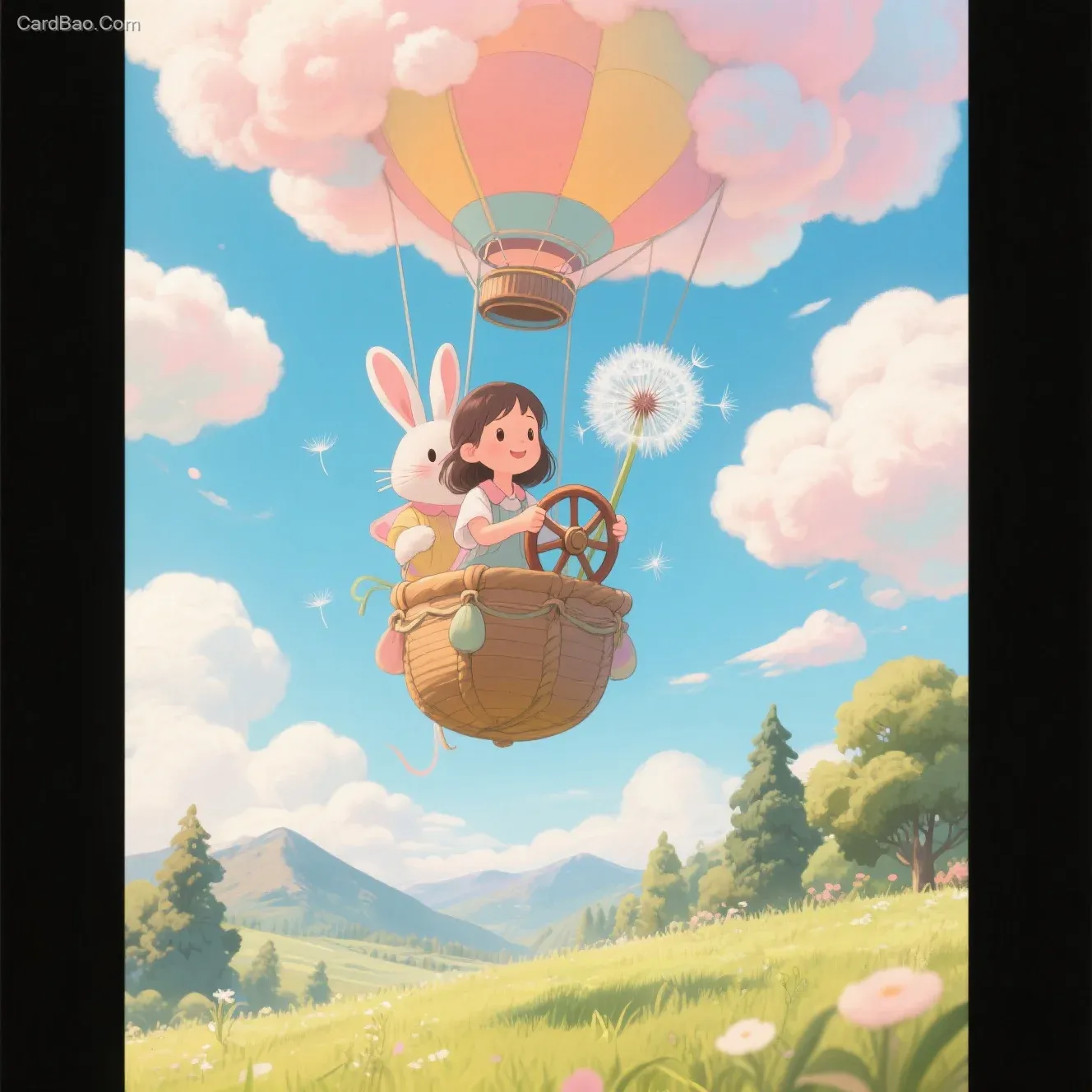 女孩和兔子坐在蒲公英热气球上,兔子握着方向盘,天空飘棉花糖云朵,下方草地树木,远处山峦,全景构图视野开阔,柔和光影渲染奇幻氛围,插画风格细节精致色彩梦幻。