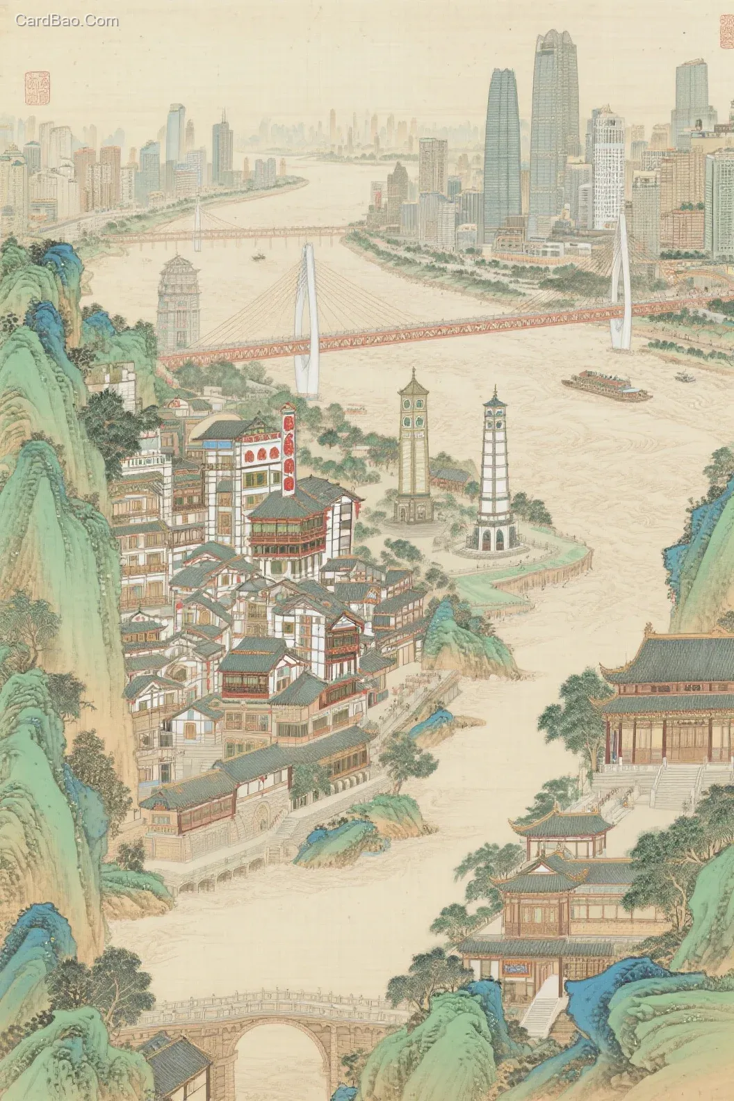 重庆全景,以洪崖洞、解放碑、长江大桥等标志性建筑为元素,采用工笔重彩风格,融合中西写实技法,以绢本细腻笔触绘制,运用青绿山水设色,展现巴渝古韵质感。借鉴清代郎世宁宫廷画院技法,采用全景式散点透视构图,通过矿物颜料多层罩染,结合建筑界画技法,对建筑细节进行精准描绘,并运用仿古绢本肌理处理,融入川渝地域色彩,营造出既有传统韵味又具现代气息的独特视觉效果。