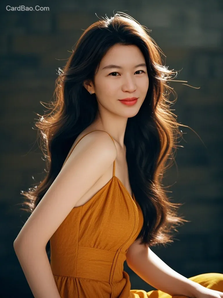 ##绝色美女,橘黄色衣服,肤白细腻光滑无暇疵,长发飘逸微乱,面部清冷,高清,回眸一笑百媚生,深色背景朦胧'