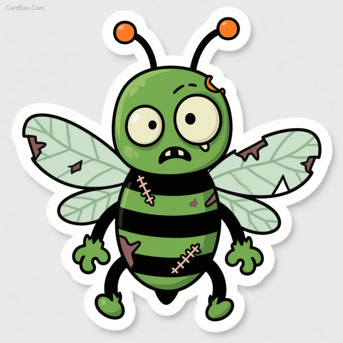 卡通风格的僵尸蜜蜂形象。它有着绿色的头部,搭配大大的、略显呆滞的眼睛,头部有两根带橙色圆点的触角。身体是绿黑相间的条纹,翅膀为浅绿色带叶脉纹理,身上有缝合线和残缺的绿色肢体,整体造型搞怪、带点破旧感,外沿有白色贴纸轮廓,背景简洁,营造趣味又独特的氛围 。