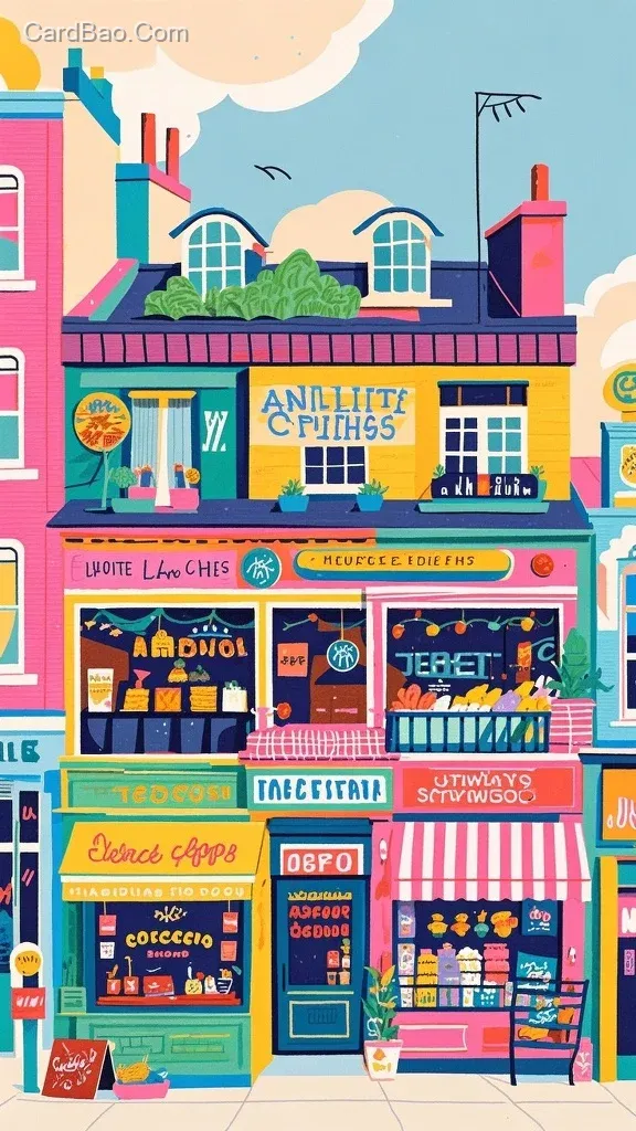 - 外观各具特色:建筑造型多样,有尖顶、坡屋顶等;色彩鲜艳,使用了粉色、黄色、蓝色、绿色等多种明快的颜色;装饰细节丰富,有的店铺门口有绿植、招牌、橱窗展示,有的屋顶有烟囱、装饰性小物件等,整体营造出活泼有趣、充满创意的商业街区氛围。