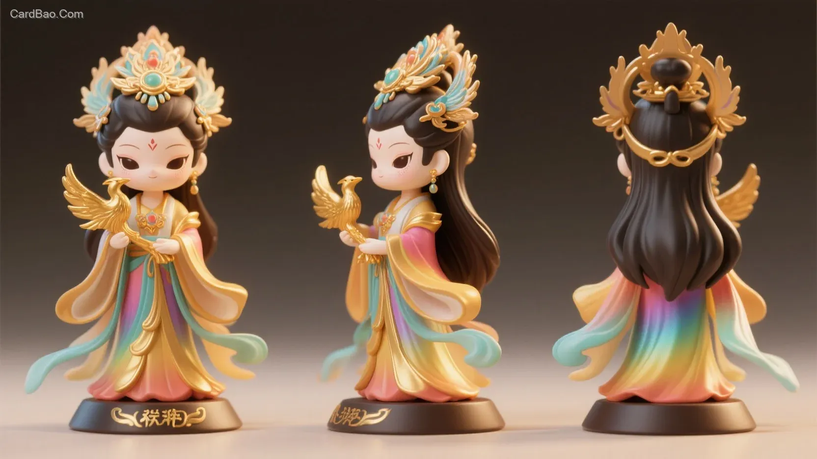 羲和手办三视图,正面神情庄重手持金乌,侧面长发飘逸头戴华丽凤冠,背面五彩霞衣随风飘动,哑光树脂材质,周身散发金色光芒,呈现神圣感,用途羲和手办宣传展示图,潮玩手办设计,等比例三视图,精致华丽,神话风格