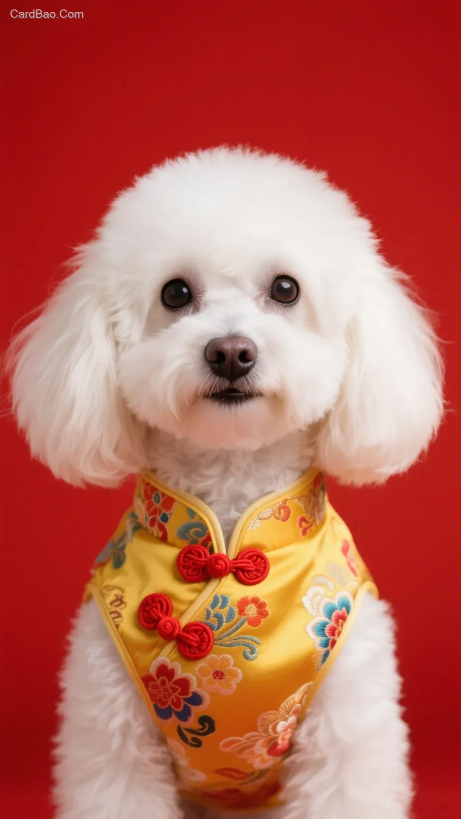 主体:一只白色直毛小狗,毛发整齐圆润,形似玩偶。身穿黄色中式传统服饰,衣服有彩色花纹、红色盘扣,增添可爱与文化氛围。