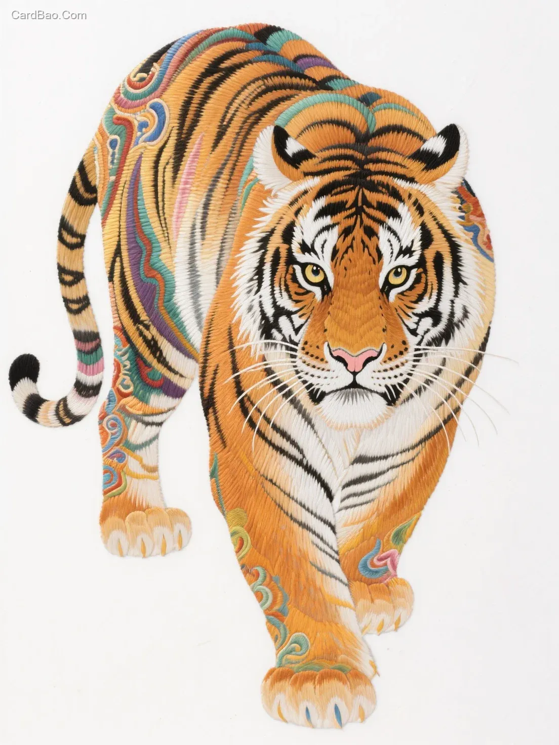 刺绣艺术,大师苏绣,彩色丝线绣品,生肖虎,抽象画风,花纹线条组合而成的猛虎,虎头向前,全身像,直视眼神,威风凛凛,压迫感太强,层次分明,中国传统纹饰,敦煌纹,色彩斑斓美轮美奂,线条柔美灵动,光泽感,饱满,发光发亮,传统美学,白色背景,高清渲染。