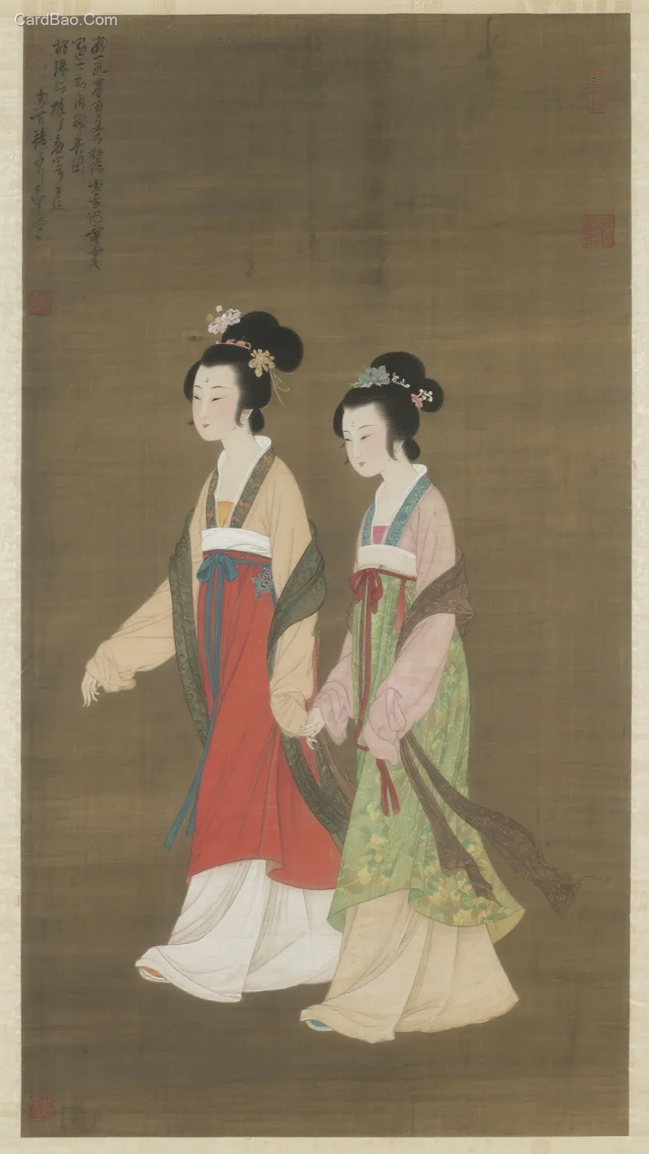 工笔重彩壁画,两位古代美女结伴向左侧方向行走。神态自若,服装色彩艳丽。暗土黄灰背景。边角有提字和印章。