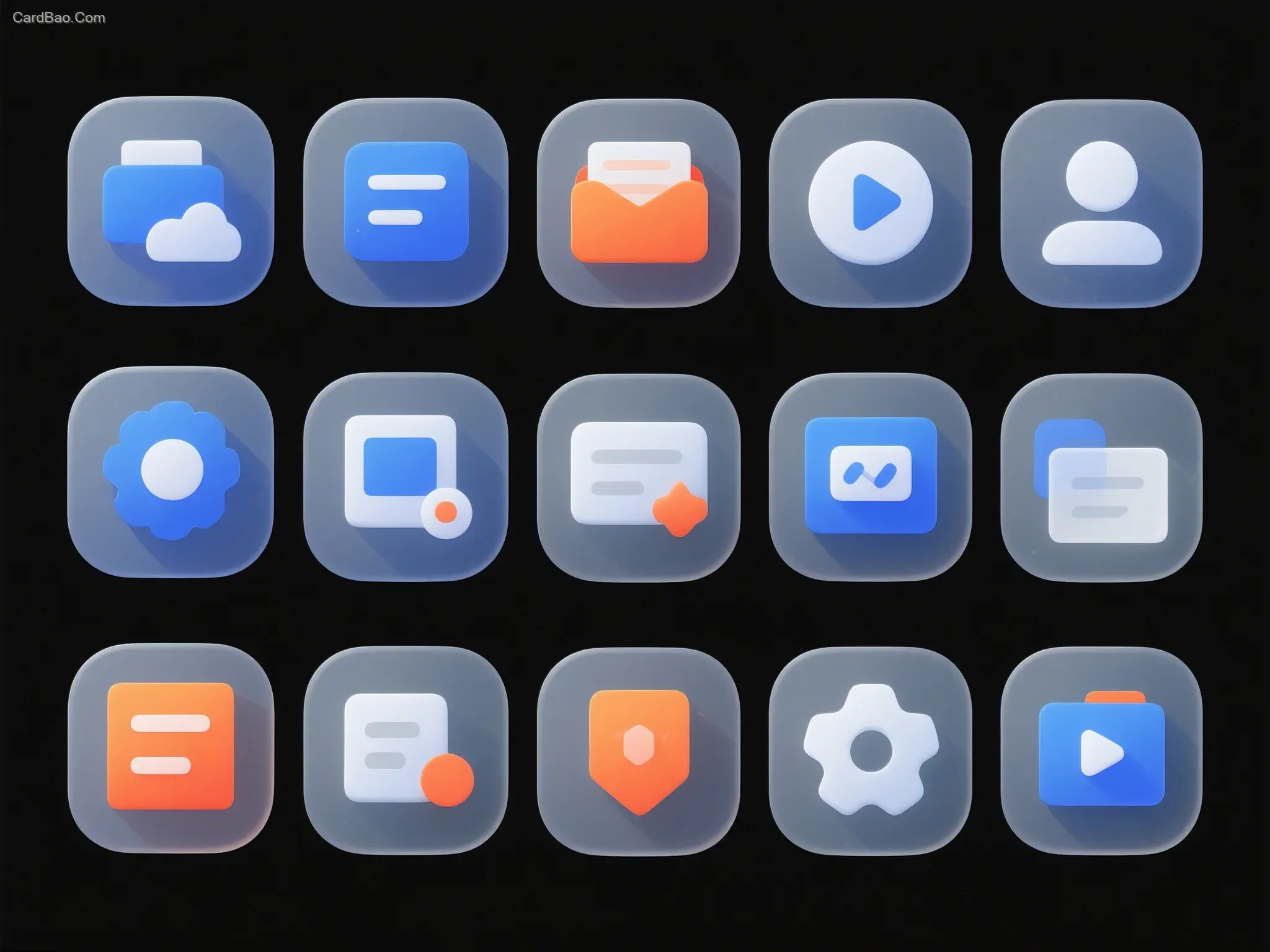 生成一套关于办公系统平台的系列图标,精美,UI,icon,浮雕感,系列感,风格统一,高级感,简约,蓝青橘白配色,最佳画质,创意,彩色,高级,半透明,纯黑色背景