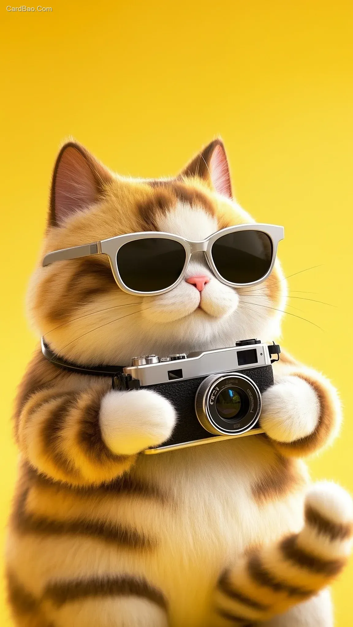 插画,艺术插画,3d渲染,毛茸茸的画面,一只懒猫,带着墨镜,拿着相机,拟人化的,做一个酷酷的动作,极简主义风格,模糊形式,黄色背景,特写,纯扁平插画,描绘清晰细致,高美感,图形化,模糊化,毛毡化,极简主义,留白,意境,高级,杰作,超现实,模糊毛茸质感,8k