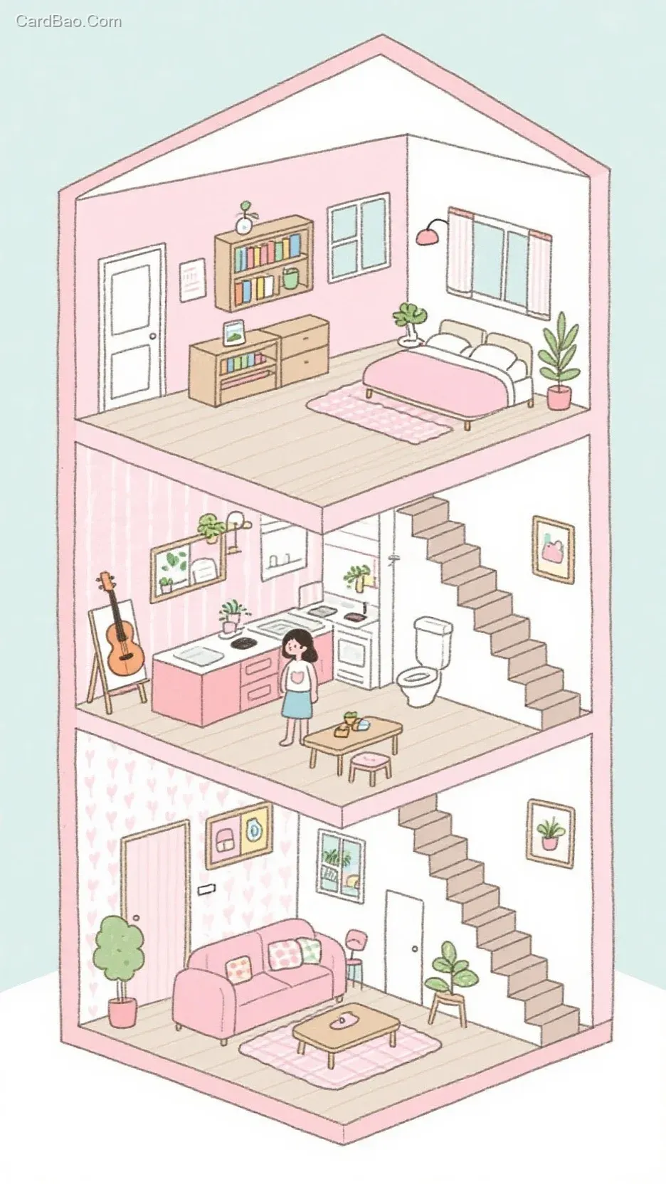 手绘插画,艺术家Yeoniu Choi风格,简笔画,线条勾勒,温馨卡通楼房室内装修,微缩场景,公寓,楼房剖面图,楼梯,所有房间都展示,正交视图,矢量,手绘,卡通,温馨,分割,一楼客厅厨房,二楼卧室浴室厕所,一共两层,精致的装饰,人物,出租屋,活动空间划分,单身宿舍,少女心,粉色系,爱好,乐器画架等,书架,治愈,墙纸,植物,
