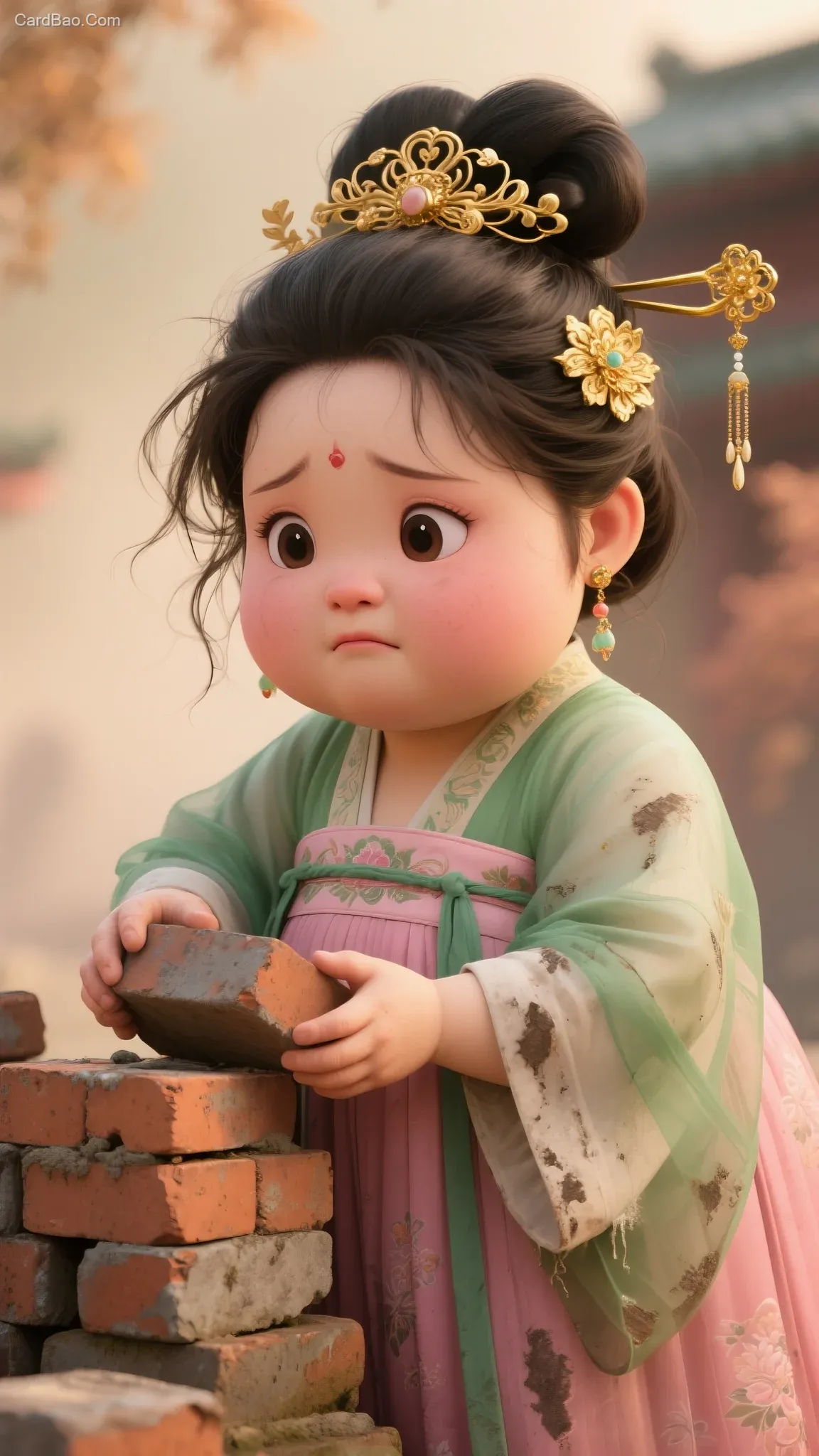 她佩戴着一对精致的耳饰,色泽温润,与整体造型相得益彰。身着传统汉服,粉色裙身搭配绿色纱衣,饰有精致花纹,整体营造出一种唯美浪漫的古风氛围。旁边有一堆砖头,女人双手拿着砖头干活,头发凌乱,身着破烂,脏兮兮的,表情难过样。背景随着整体内容模糊