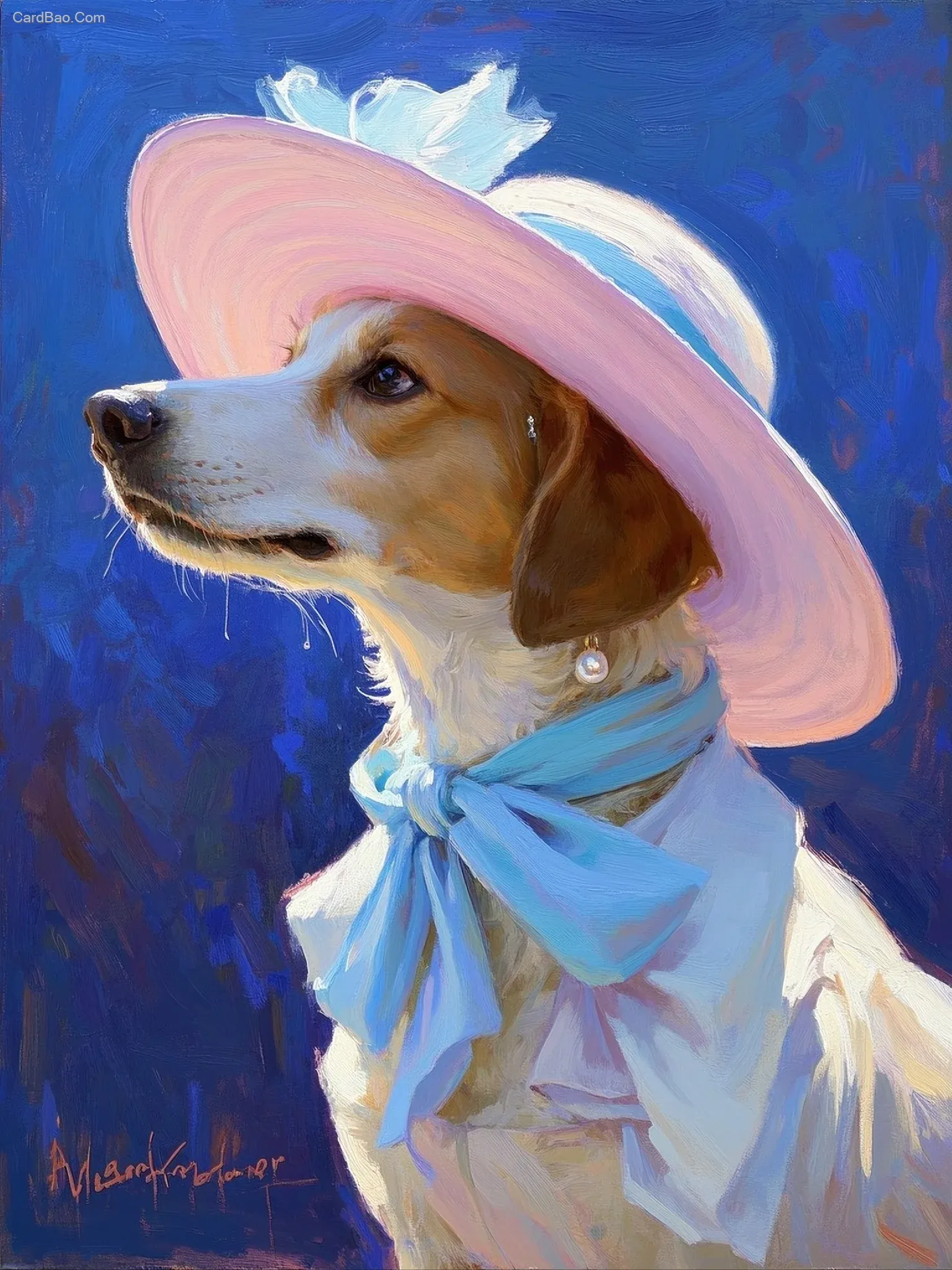 一幅写实风格的数码油画,描绘了一只浅色系的小狗咪,头戴别致的浅粉色宽檐帽,系着精致的浅蓝色围巾,身着飘逸的浅色调连衣裙。小狗还佩戴着优雅的珍珠耳坠。背景是深邃浓郁的蓝色,柔和自然的光线增强了纹理和细节,营造出精致迷人的氛围。