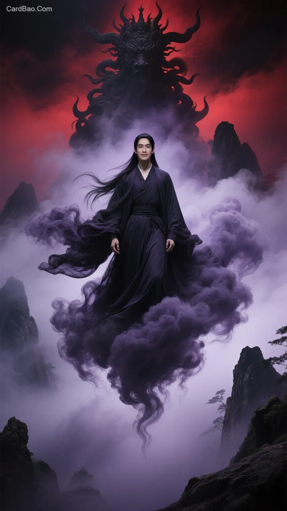 ## Generate an image for me: Realistic, a giant scene formed by black-purple mist and clouds, visually striking, from the "Classic of Mountains and Seas," where the mist and clouds merge into one, with a dark-red misty background. A celestial being (with an immortal and dignified aura) hovers mid-air, long hair and robes fluttering. Terrifying, dreamlike, awe-inspiring, cinematic, surreal. Eastern aesthetic.