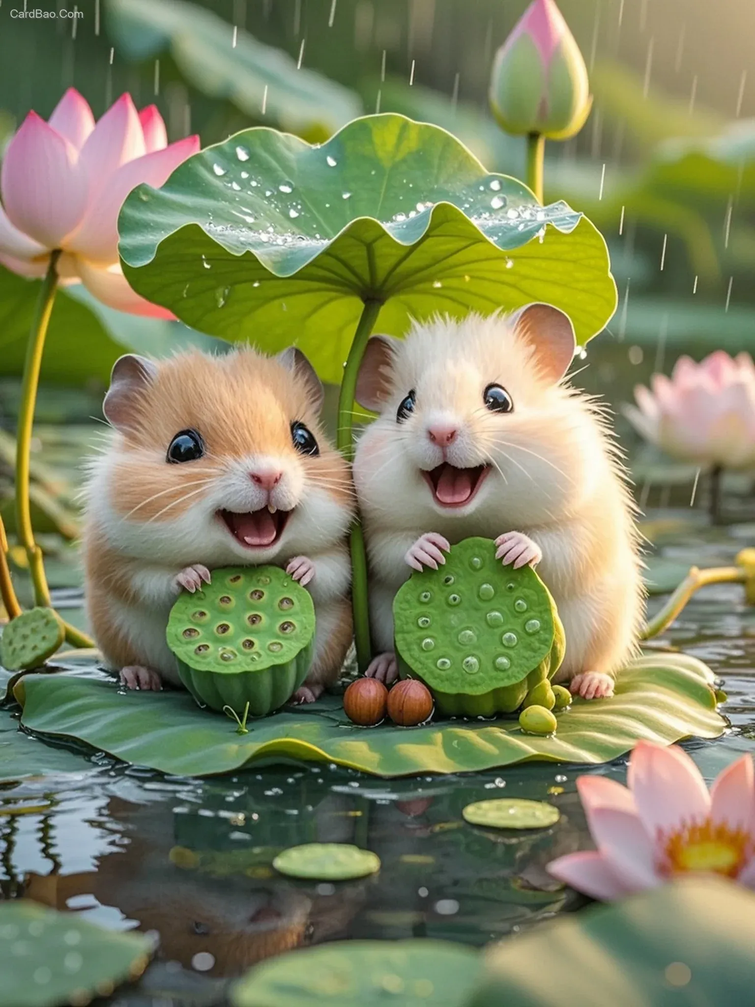 Q版,天空下着小雨,超大的荷叶上坐着一对小仓鼠,奶白色毛发,满脸微笑,各自手举着一支小荷叶,荷叶在头顶上,背景是荷塘,有漂亮的荷花和莲蓬,微距实拍,景深,超高清,极致细节,4k,3D,电影质感