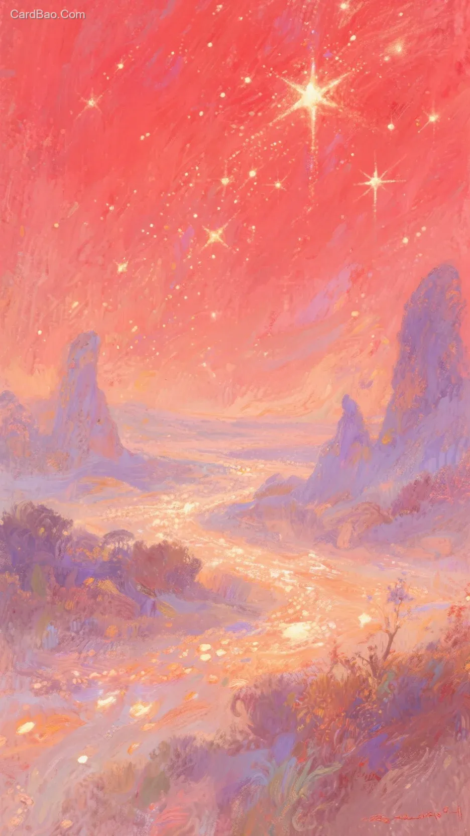 采用松散的笔触与晕染技法,油画丙烯创作。发光的星海,敦煌神话中的极乐世界,稀碎星光,有线条亮光,颗粒发光,光泽感,弱化物体精准轮廓,轻柔涂抹营造朦胧氛围,印象派对光影与色彩氛围的捕捉,强调整体意境的诗意表达。红色为主调,构建梦幻基底,色调柔和淡雅,冷暖交融淡橙色与淡紫色营造出温馨空灵的视觉效果,传递自然的宁静之美。造型写意化,不追求细节写实。以模糊形态展现层次,通过色彩与光影暗示物体存在,侧重场景意境构建,赋予画面想象空间,凸显自然景物的灵动与生机。