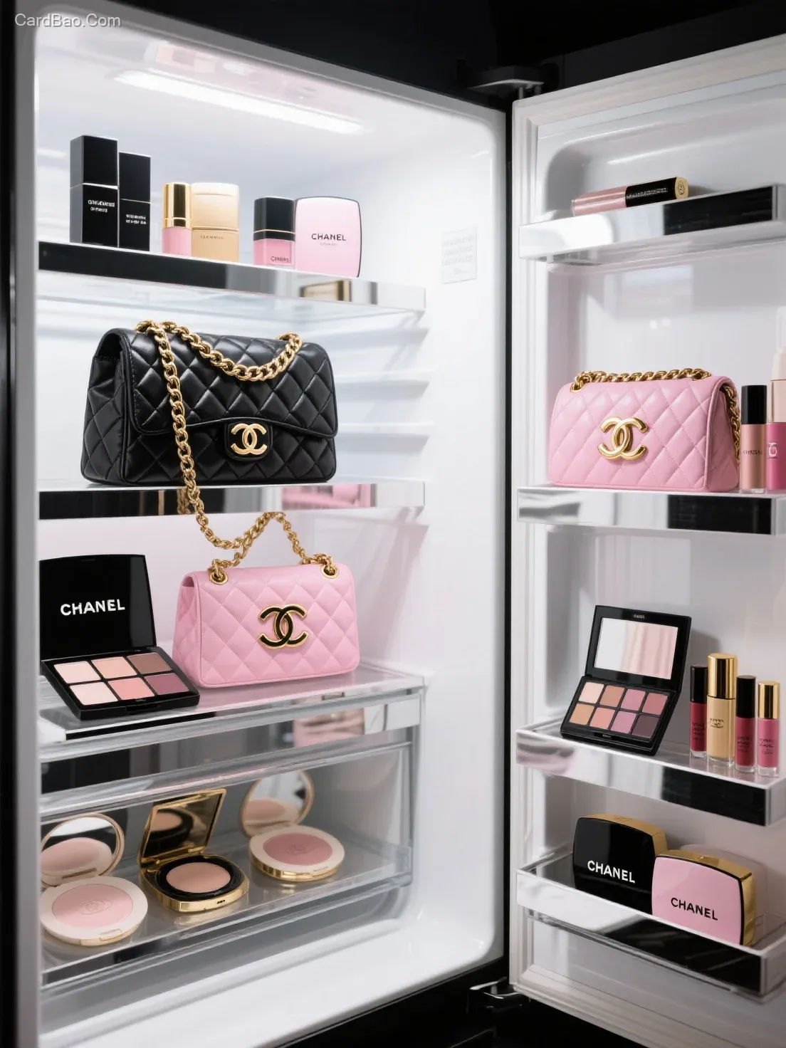 物品:香奈儿经典黑色菱格纹链条包、粉色与金色装饰的香奈儿包包、香奈儿彩妆产品(眼影盘、粉饼、口红等 )