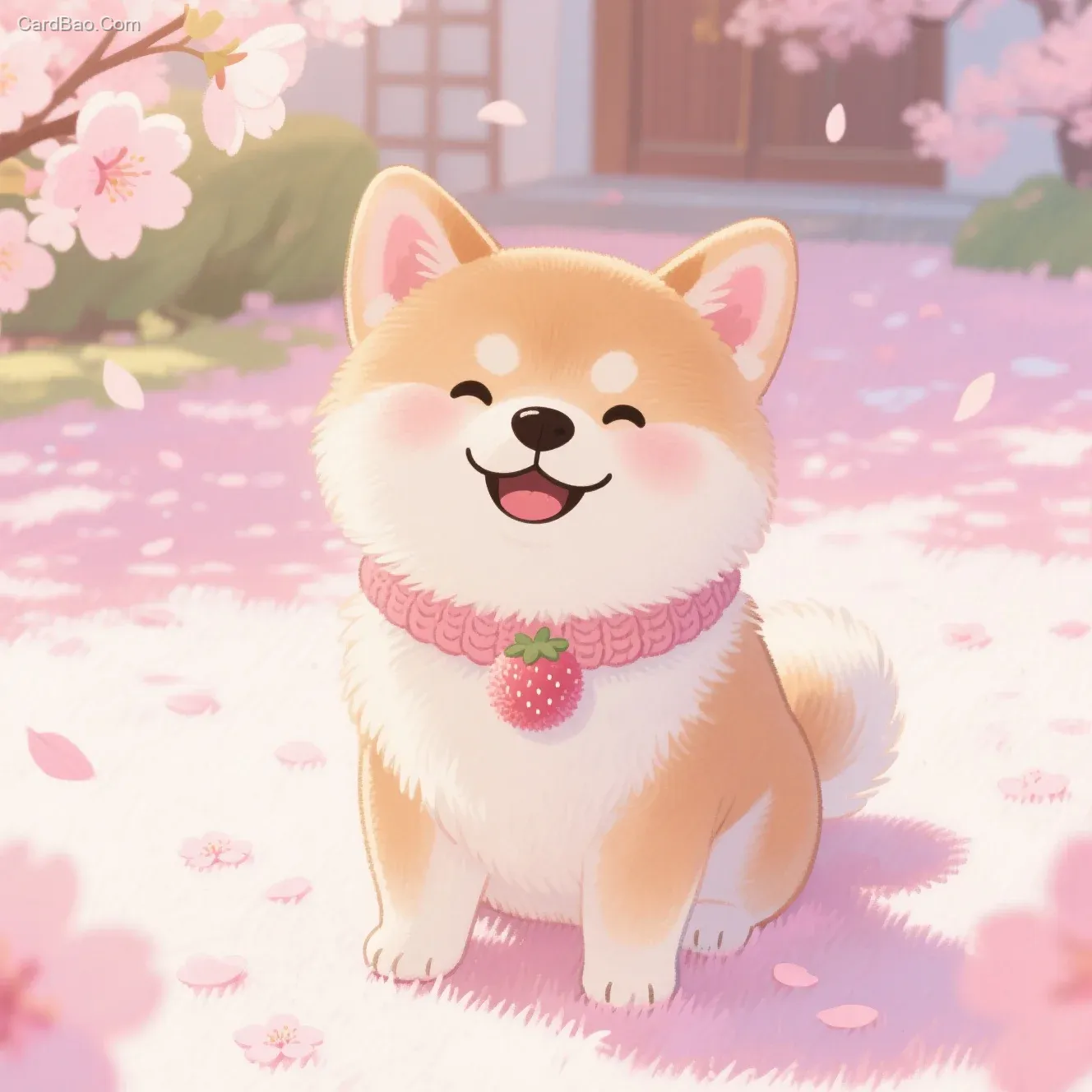 仿「Lynn Chen萌宠插画」风格,线条圆润如蜡笔,色彩柔和带粉调。画面中心是【豆柴犬】,毛发是【蓬松棉花质感(浅棕渐变奶油白)】,耳朵是【飞机耳形态(边缘泛淡粉晕)】,表情是【歪头笑(嘴角露小乳牙)】,戴着【针织草莓项圈(带绒毛球)】。背景是【樱花季庭院】,铺【粉白渐变樱花地毯(花瓣飘半空)】,暖光从左上方45°斜射,在柴犬右侧投下【毛茸茸阴影(边缘模糊)】,边缘泛0.3mm淡粉光晕
