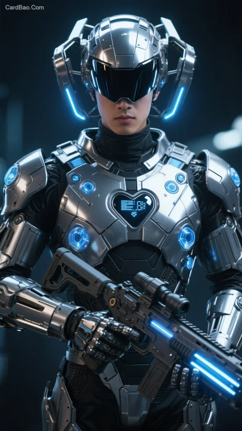 Mecha Warrior, Guardian of Earth – a handsome yet stern-faced young Chinese man. The metal visor on his head has split open from the center and retracted to both sides, ready to close upon command. His eyes are concealed behind a sleek, metallic-black reflective visor that emits a faint glow (no visible eyes). He wears silver armor crafted from a unique metallic alloy, adorned with multiple transparent buttons glowing blue. A miniature LCD digital display is embedded over his heart on the left side of his chest. The armor boasts an ultra-cool, hyper-futuristic metallic design. In his hand, he carries an advanced dual-barrel laser submachine gun equipped with a night vision scope, poised for battle at any moment.