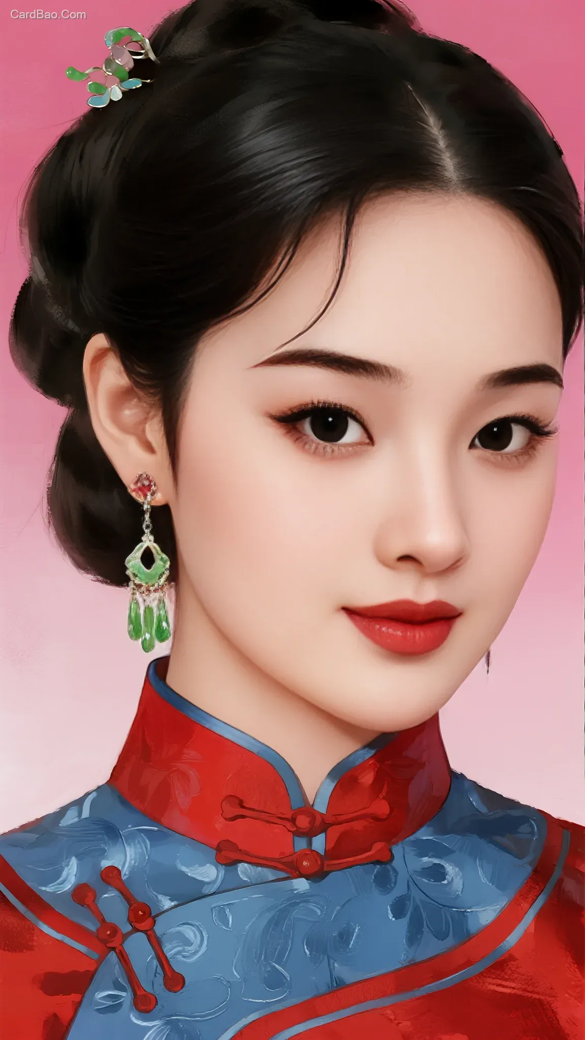 ##主题描述:精致瓜子脸民国少女低头浅笑,乌木盘发配头饰,穿红色镶边蓝色绸缎旗袍,纤细苗条身形呈现优雅曲线。美学描述:油画笔触细腻展现白皙肌肤与精致妆容,渐变粉红色背景衬托立体五官,高饱和度色彩突出翡翠耳坠与唇色粉嫩,浅景深构图聚焦清澈眼眸纤长睫毛。专业词:32K超高分辨率呈现纹理与布料光泽,3D立体效果强化面部光影层次,9:16竖构图强化人物仪态,高动态范围光影塑造翡翠流苏与绸缎褶皱细节。