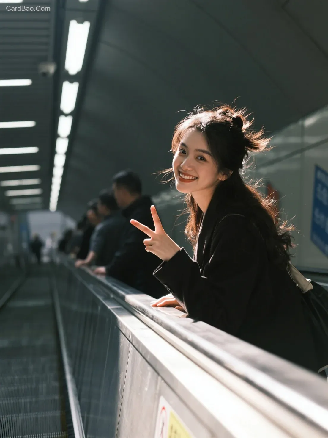 高颜值女子,盘头,排队站在地铁扶梯上,她情的看向我,眼睛充满了浓浓的爱意,向镜头比了个可爱的剪刀手。灰色侧光,暗调,伦勃朗光,强烈明暗对比,高反差,长发的前卫女生,碎发丝飘起,阳光,快乐,自信,活力,松弛感,肌理质感,情绪氛围感拉满,奇特视角,胶片颗粒感,慢快门,朦胧美学,层次感,俏皮。无过曝。35定焦摄影。镜头无畸变。,写实,写真,电影质感。