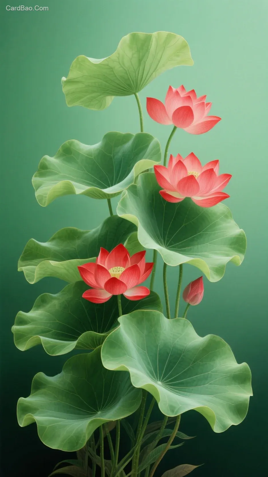 帮我生成图片:这是一张超现实主义风格的高清壁纸,极简,留白,融合了新工笔与创意摄影的特点,以简约的设计呈现。画面以绿色背景为底,盛开着层层叠叠、风情万种的荷花,由光影和线条构成,没有实体,如梦似幻。翠绿色的叶子衬托着红色的花朵,借鉴了萨尔瓦多达利的艺术风格,营造出逼真而又空灵的效果,宛如仙境,画面细致描绘,充满了梦幻与浪漫的气息。