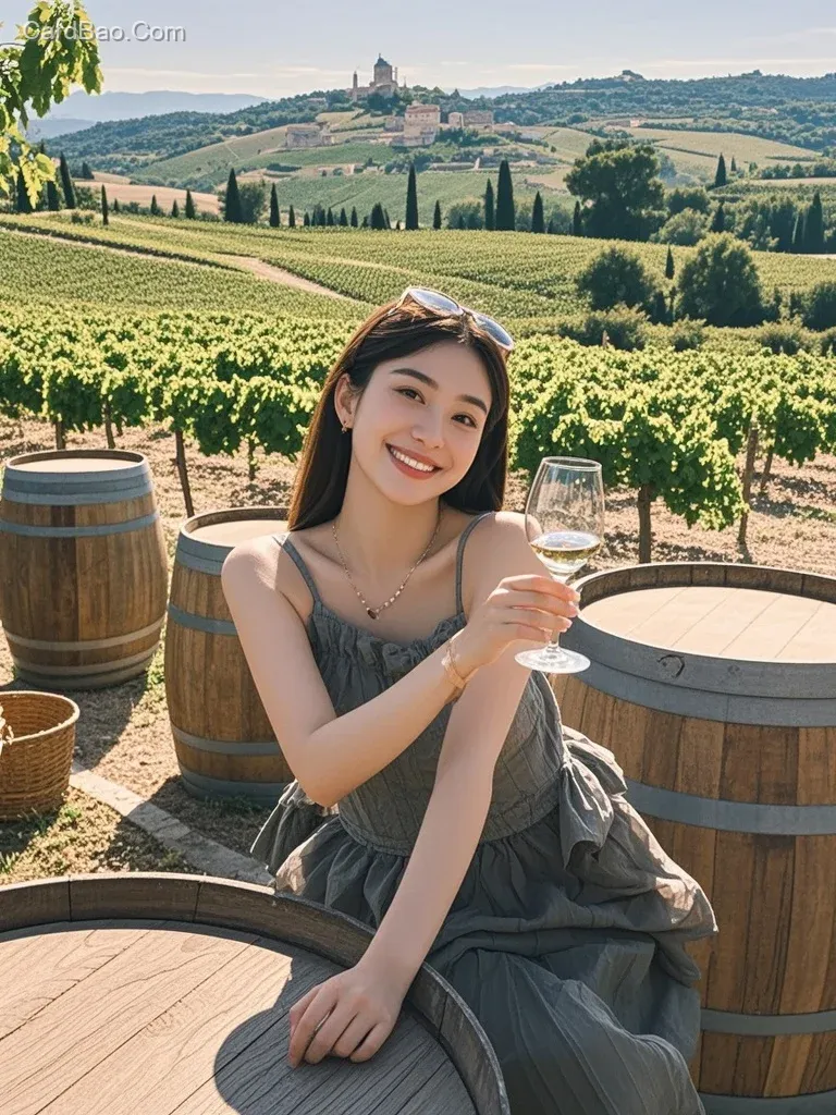 18 岁女生在西班牙浪漫的葡萄酒庄,脸带微笑,半动态。她的一只手轻轻握住酒庄里的高脚杯,手指优雅地搭在杯身,仿佛在感受酒杯的质感,另一只手自然下垂,身旁是排列整齐的酒桶与葡萄藤,充满浪漫氛围。